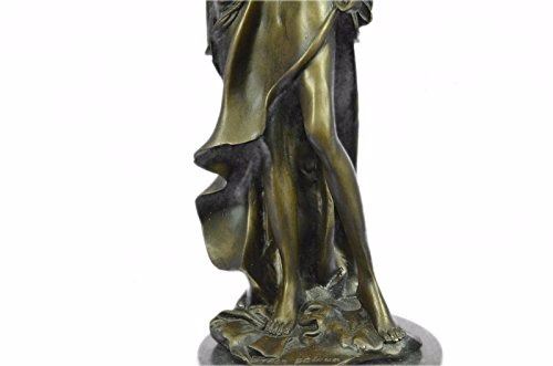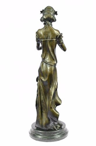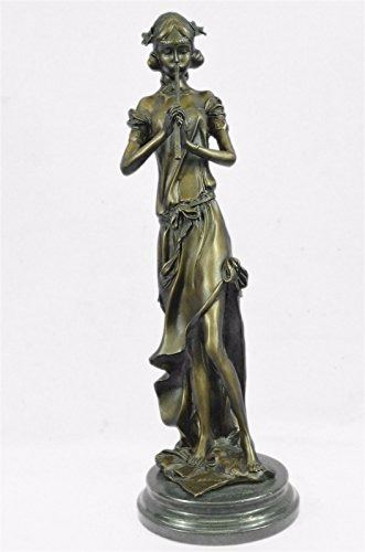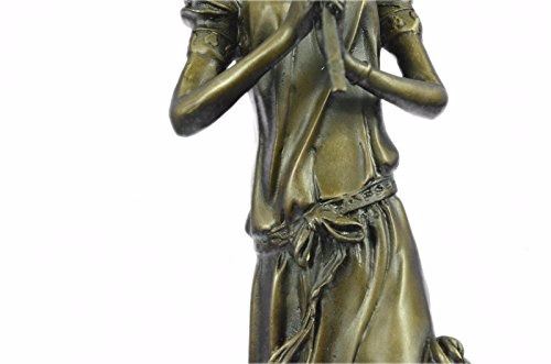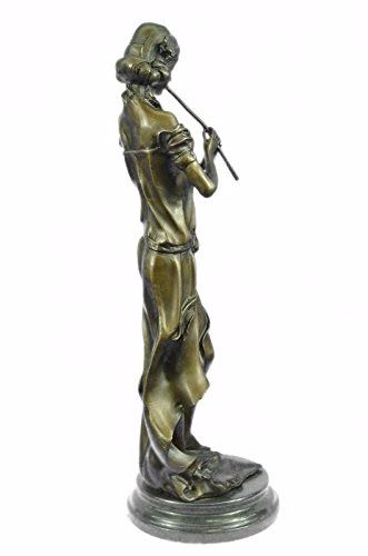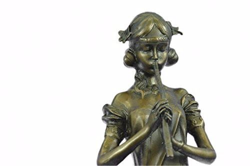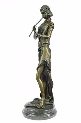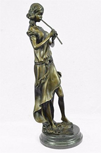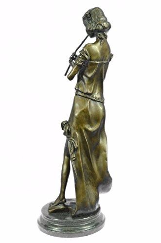 A Young Woman Plays A Soothing Song On Her Flute. She Puckers Her Lips Around The Slender Instrument And Blows. She Shuts Her Eyes And Listens To Her Melody, Confident That She Will Not Hit Any Sour Notes. Her Musical Notes Lift Into The Air That Swirls Around Her. Her Golden Yellow Patina Goddess Dress Hangs Loosely Over Her Slender Body. She Entertains All Who Steal A Moment To Listen To Her Sweet Lullaby. 100% Bronze And Handmade, This Brown Patina Sculpture Was Cast Using The “Lost Wax Method” And Is Mounted On A Round Marble Base. Size: 20X7 inches. Weight: 14 LBS.