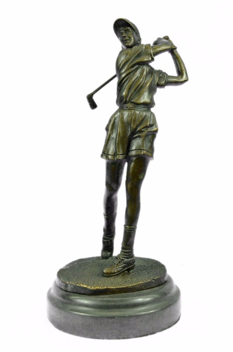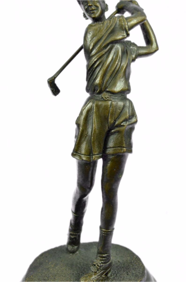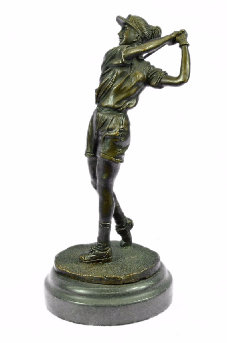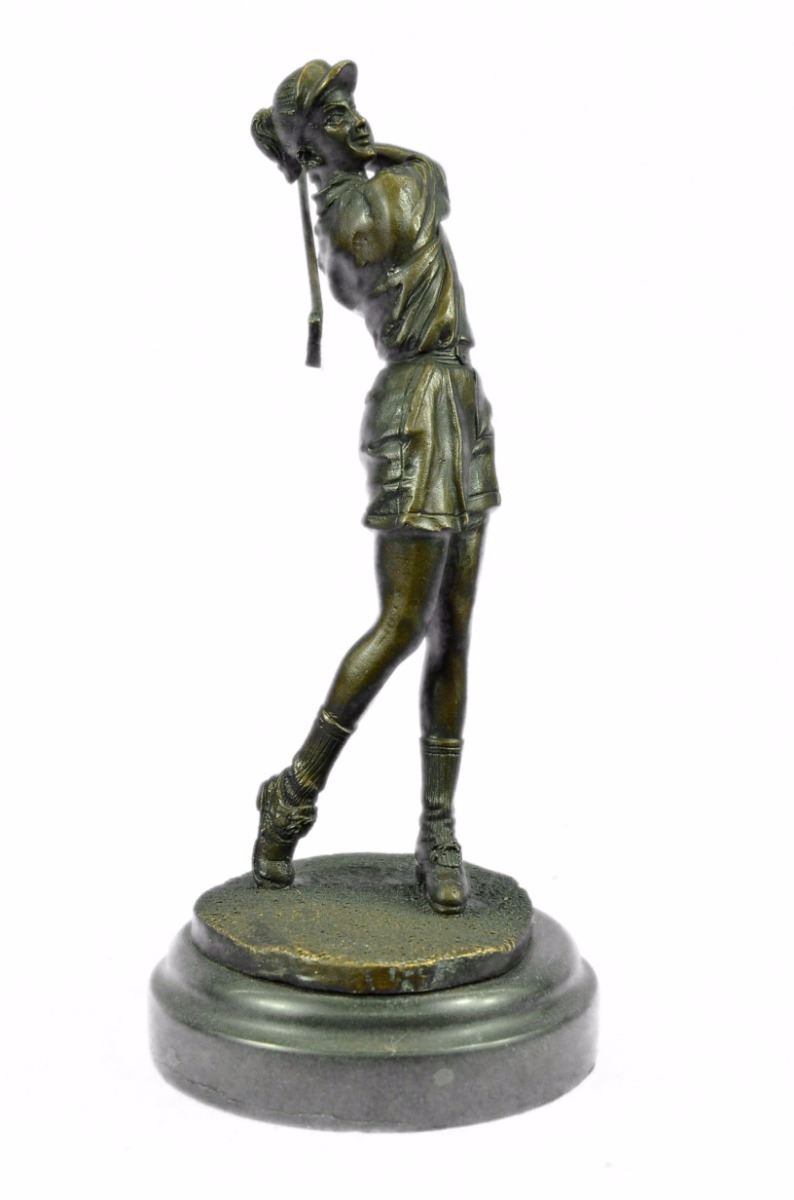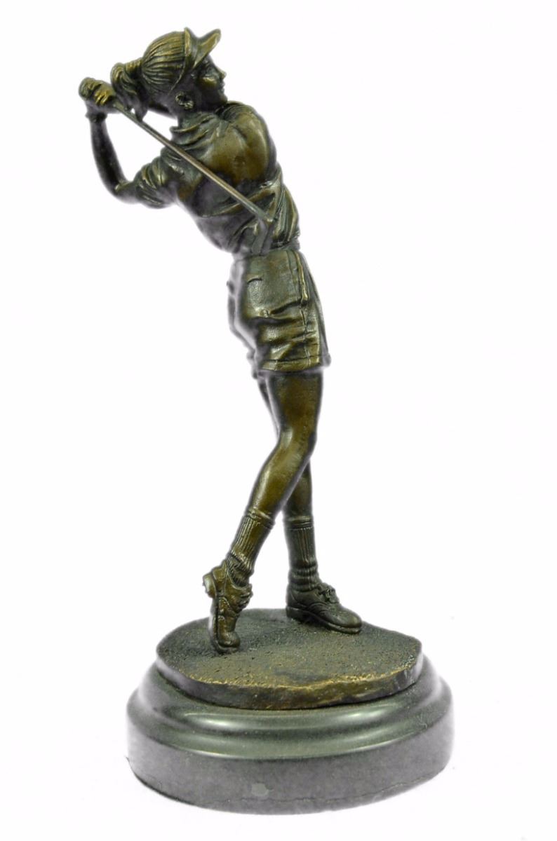 A Golfer Tilts Her Head Up To The Sun And Watches Her Ball Rise. She Holds Her Form And Stance, Tracking The Position Of The Ball And How Close To The Green It May Land. Her Body Twists With Her Stroke. In Her Head She Counts The Strokes She May Need If It Doesn't Land On The Green And How Many She May Need If It Does. She Silently Prays That It Doesn't Land In A Sand Trap Or Near A Water Hazard. Though The Crowd Has Already Begun To Erupt In An Uproar, She Knows It's Too Soon For Celebration. The Ball Is Left To The Wind. She Wears A Cotton Tee Shirt, Skirt, And Cap. There Are Fine Details To Appreciate Like The Ripples Of Her Moving Clothes And The Rough Patches Of The Manicured Grass. This Handmade 100% Bronze Sculpture Was Cast Using The "Lost Wax Method" And Mounted On A Marble Base. Bronze Dimensions With Marble Base: Height 10 X Width 4 inches. Weight: 5 Lbs.