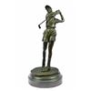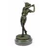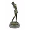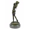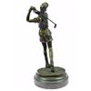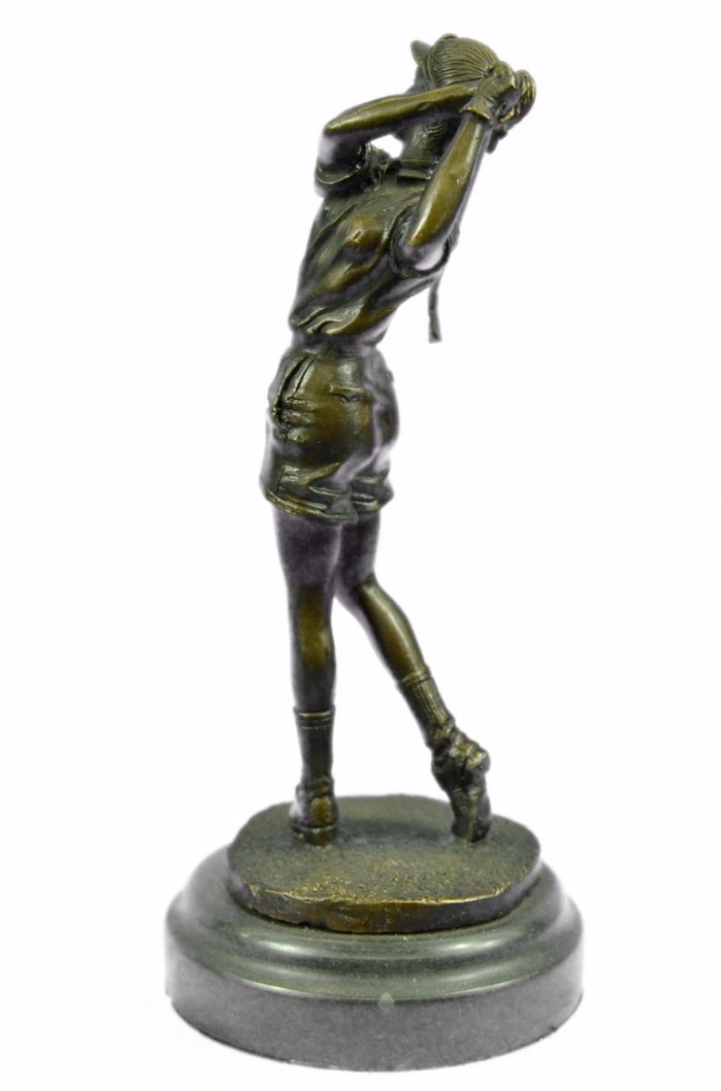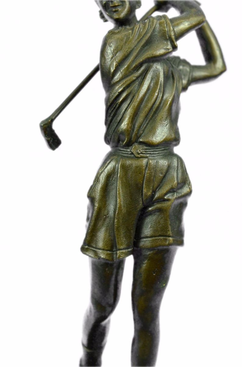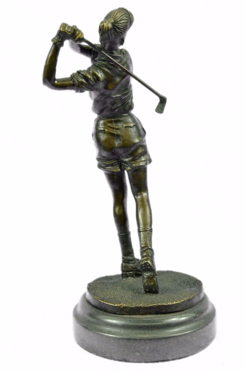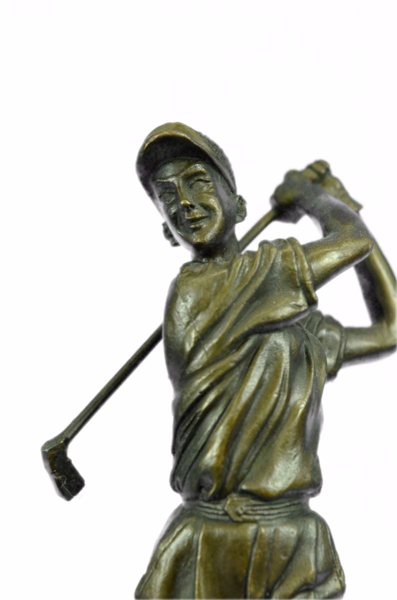 A Golfer Tilts Her Head Up To The Sun And Watches Her Ball Rise. She Holds Her Form And Stance, Tracking The Position Of The Ball And How Close To The Green It May Land. Her Body Twists With Her Stroke. In Her Head She Counts The Strokes She May Need If It Doesn't Land On The Green And How Many She May Need If It Does. She Silently Prays That It Doesn't Land In A Sand Trap Or Near A Water Hazard. Though The Crowd Has Already Begun To Erupt In An Uproar, She Knows It's Too Soon For Celebration. The Ball Is Left To The Wind. She Wears A Cotton Tee Shirt, Skirt, And Cap. There Are Fine Details To Appreciate Like The Ripples Of Her Moving Clothes And The Rough Patches Of The Manicured Grass. This Handmade 100% Bronze Sculpture Was Cast Using The "Lost Wax Method" And Mounted On A Marble Base. Bronze Dimensions With Marble Base: Height 10 X Width 4 inches. Weight: 5 Lbs.