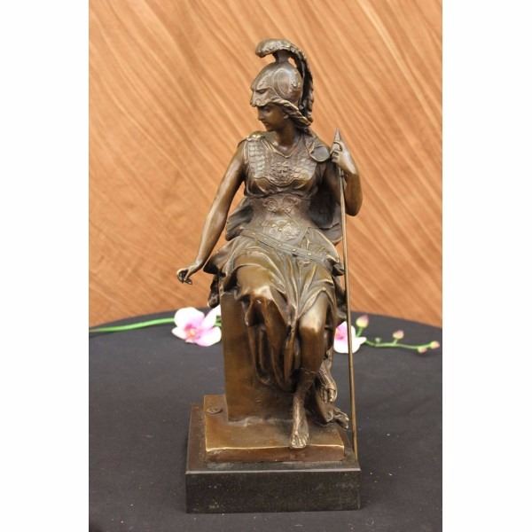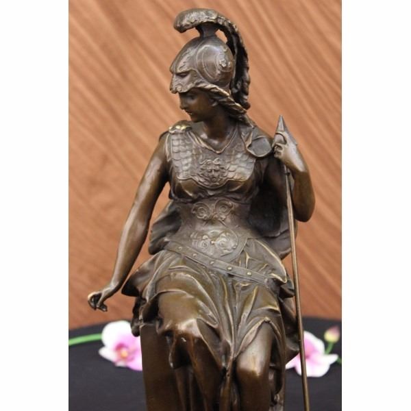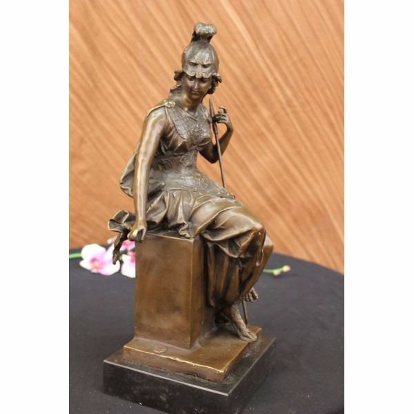 The Female Warrior Appears Downtrodden Or Contemplative. She Sits Down Firmly Grasping Her Spear. Her Detailed Outfit Includes An Ancient Greek Helmet, Body Armor And Long Skirt. This Sculpture Offers A Different Type Of War Piece Revealing The Moment The Exists Outside Of Battle. It Was Crafted Using The Lost Wax Method. It Rests On A Black Marble Base. Bronze Dimensions With Marble Base: Height 17 X Width 8 inches. Weight: 17 Lbs. Please Note: This is a reproduced bronze sculpture from the original molded and signed. This featured bronze sculpture is a recast after the original, and has been done recently. This 100% bronze sculpture is an abstract piece certain to be a conversation piece.