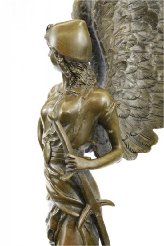 A female warrior angel stands in the heavens, ready to defend mankind.Her wings arch high above her, showing its wide span. She casually perches a hand on a hip, while clutching her mighty sword in the other. Her long goddess dress, hikes up her thigh and cascades to the ground. She stands with a foot on some harvest fruit. This brown patina sculpture was cast using the Lost WaxMethod and mounted on a marble base. Dimensions: Height 25 X Width 7 inches. Weight: 17 LBS.