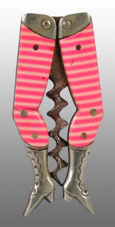 Description Henkel, Germany. Early 1900s. 2 - 5/8-inches tall with legs opening to form 5 - 1/4 -inch long handle. Silvering off top half of corkscrew. Striking pink and white celluloid grips have three fine hairlines by three of the tiny rivets but show little and cause no problem. Extremely clean grips. Condition (Excellent). Size 2 - 1/2".