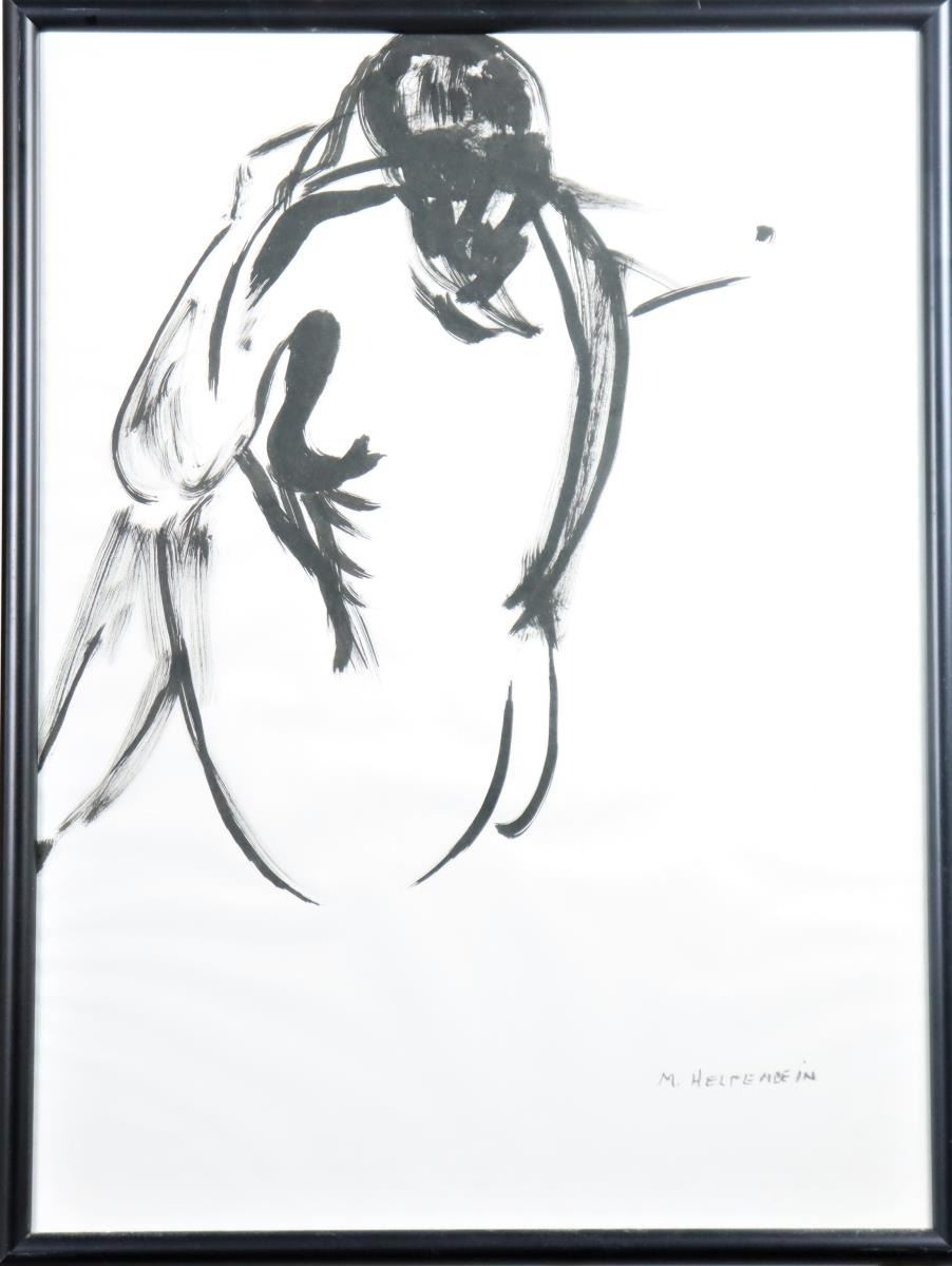 Female Nude sketch, ink wash on paper, framed under glass. "M Helfenbein" lower right.