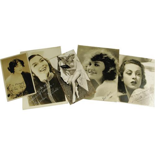 <B>Female Stars Autographs Lot: Betty Grable, Rosalind Russell, Aileen Pringle, Doris Kenyon, Danielle Darrieux.</B></I> The pageant includes: 1.) a 4.5" x 8.5" photo of Betty Grable, showing off her "million dollar legs" in a bathing suit and signed in gray ink, 2.) 7" x 10" head-and-shoulder portrait of Rosalind Russell, late 1930s era, signed in white ink, 3.) 4.5" x 7.5" portrait of Silents star -turned Talkies-bit player Aileen Pringle, signed in black fountain pen, 4.) 7" x 9" smiling head-and-shoulder shot of Valentino leading lady Doris Kenyon, and 5.) a lush 7" x 8" portrait of Parisian beauty Danielle Darrieux, signed in French. All in Very Fine + condition.<BR><BR><b>Shipping:</b> Flat Material, Small (<a target="_blank" href="http://www.heritageauctions.com/common/shipping.php">view shipping information</a>)