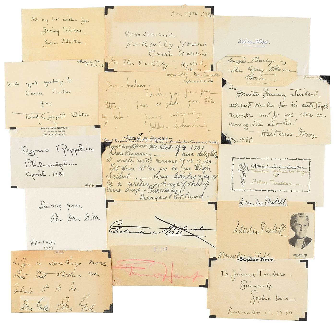 Collection of 16 items signed by notable female authors, poets, historians, and essayists, with the majority signing in ink or ballpoint on individual slips or cards, unless otherwise noted, ranging in size from 3.5 x 1.5 to 5.5 x 3.25. Some examples are mounted and/or bear affixed clippings, captions, or corners. The group includes: Gertrude Atherton, Temple Bailey, Margaret Deland (ANS), Dorothy Canfield Fisher, Zona Gale (AQS), Corra Mae Harris, Fannie Hurst, Sophie Kerr, Frances Parkinson Keyes, Daphne du Maurier (ANS), Katherine Mayo (ANS), Alice Duer Miller, Kathleen Norris, Julia Peterkin, Agnes Repplier, and Ida Tarbell. In overall very good to fine condition.