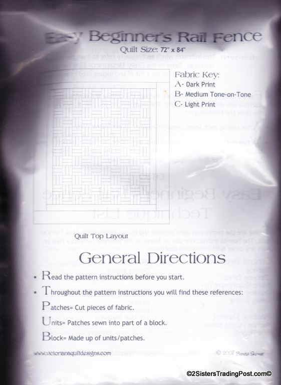 Pattern & approximately 4 yards of fabric for an 'Easy Beginner's Rail Fence' quilt size 72" x 84". This quilt has been started and there is enough fabric to make the 120 squares for the center pattern. You will need cotton fabric for the boarder edge trim and backing. There are 6 squares of 4 already assembled, 54 single squares, 1-42" strip ready to cut into squares and enough yardage in strips to finish the squares. NOTE: there is not enough fabric for boarder, edge trim or backing & batting IS NOT included.