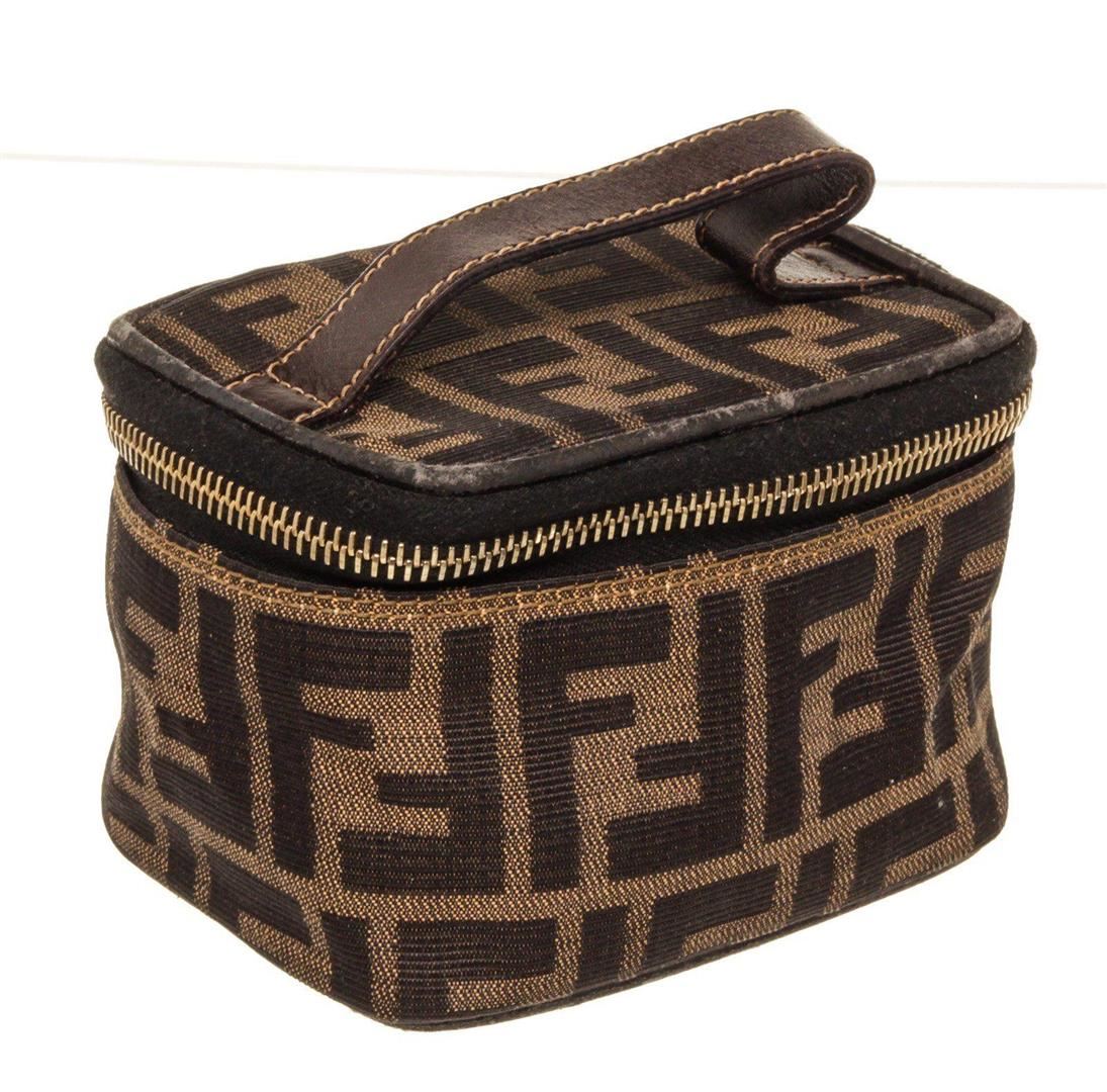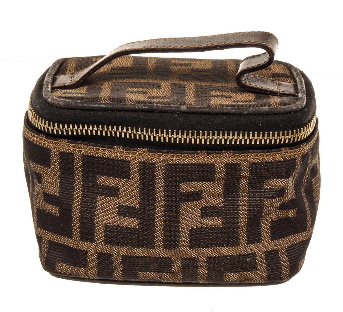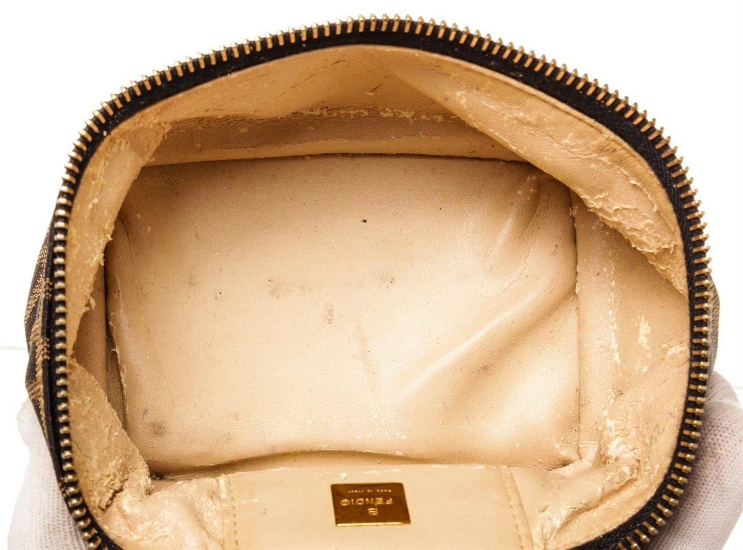 Fendi Brown Black Canvas Mini Vanity Shoulder Bag with gold-tone hardware and leather zipper.