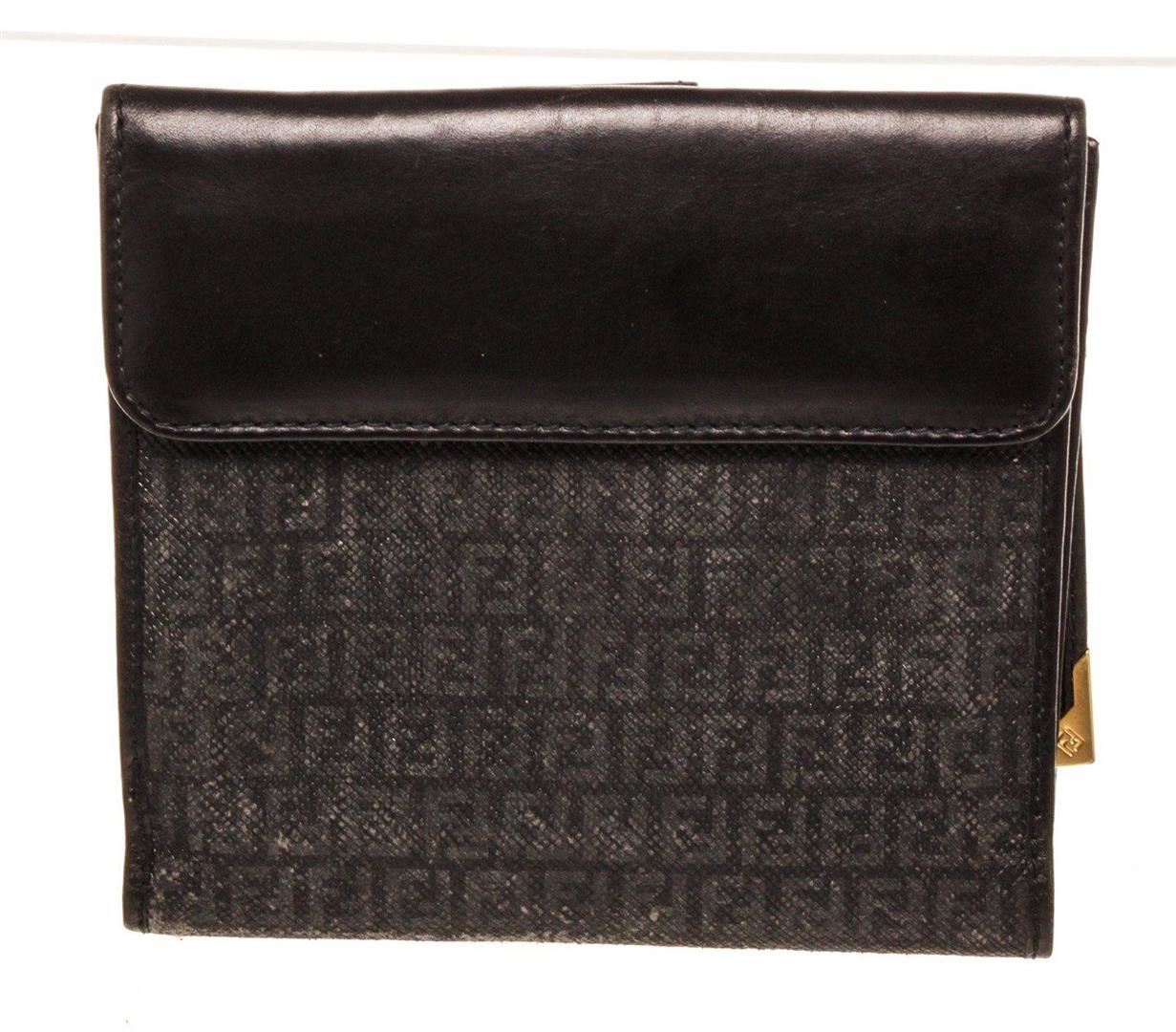 Fendi Black Canvas Compact Tab Wallet with canvas gold-tone hardware, interior card holder pockets and snap closure.