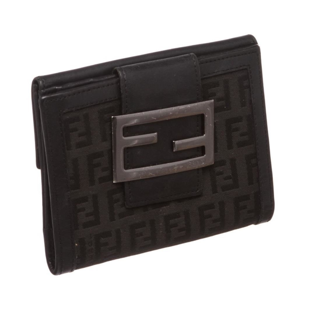 Overall push button closure. Interior contains multiple compartments, bill slip pocket, and one change snap closure pocket. Item is pre-owned. Item Dimensions: 5"x0.5"x4"/12.7cmx1.27cmx10.16cm.
