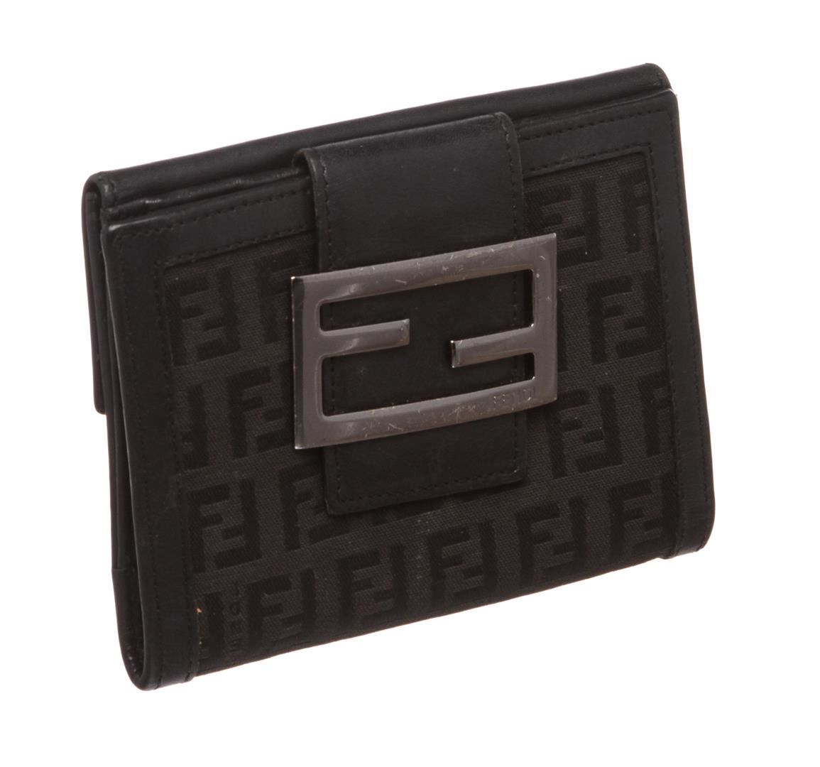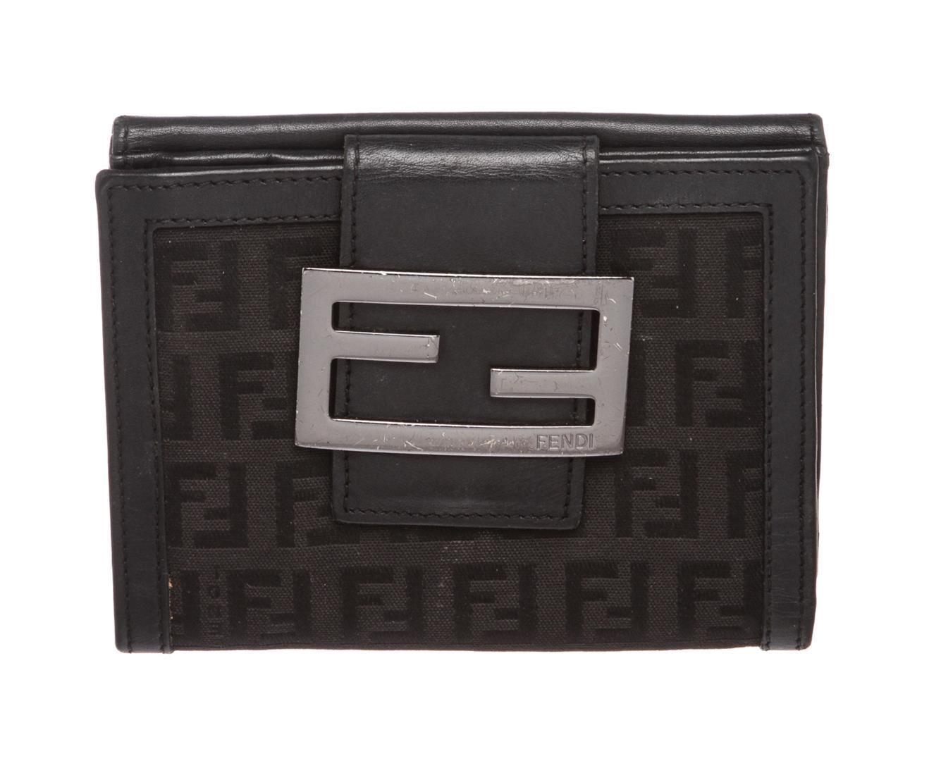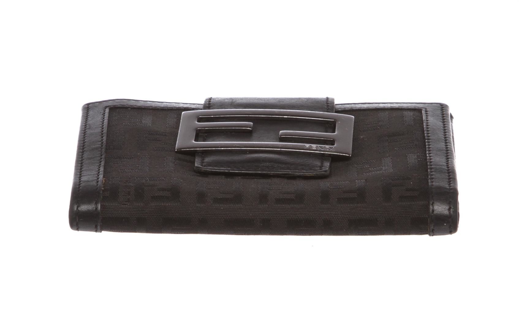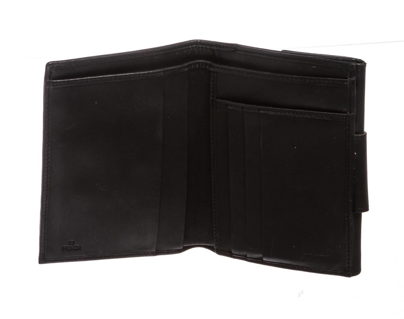 Overall push button closure. Interior contains multiple compartments, bill slip pocket, and one change snap closure pocket.