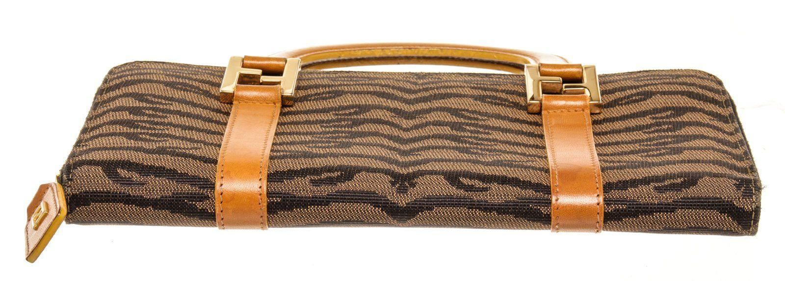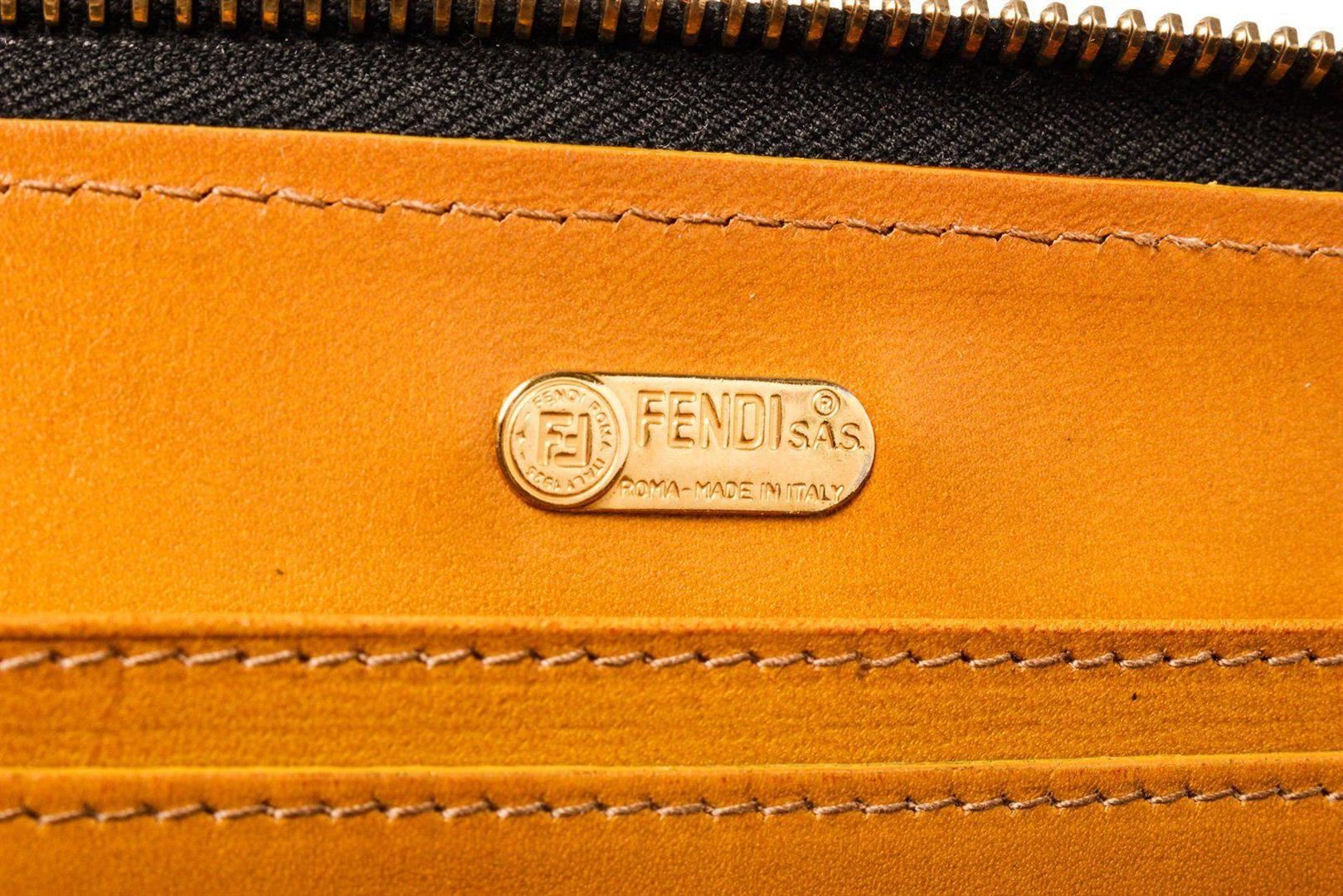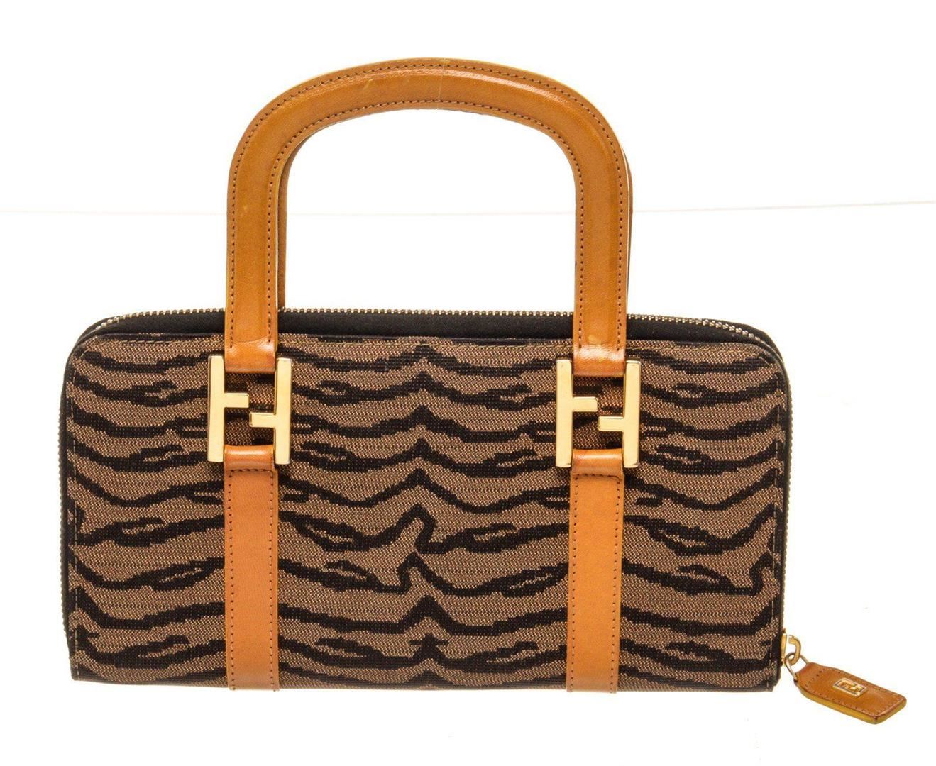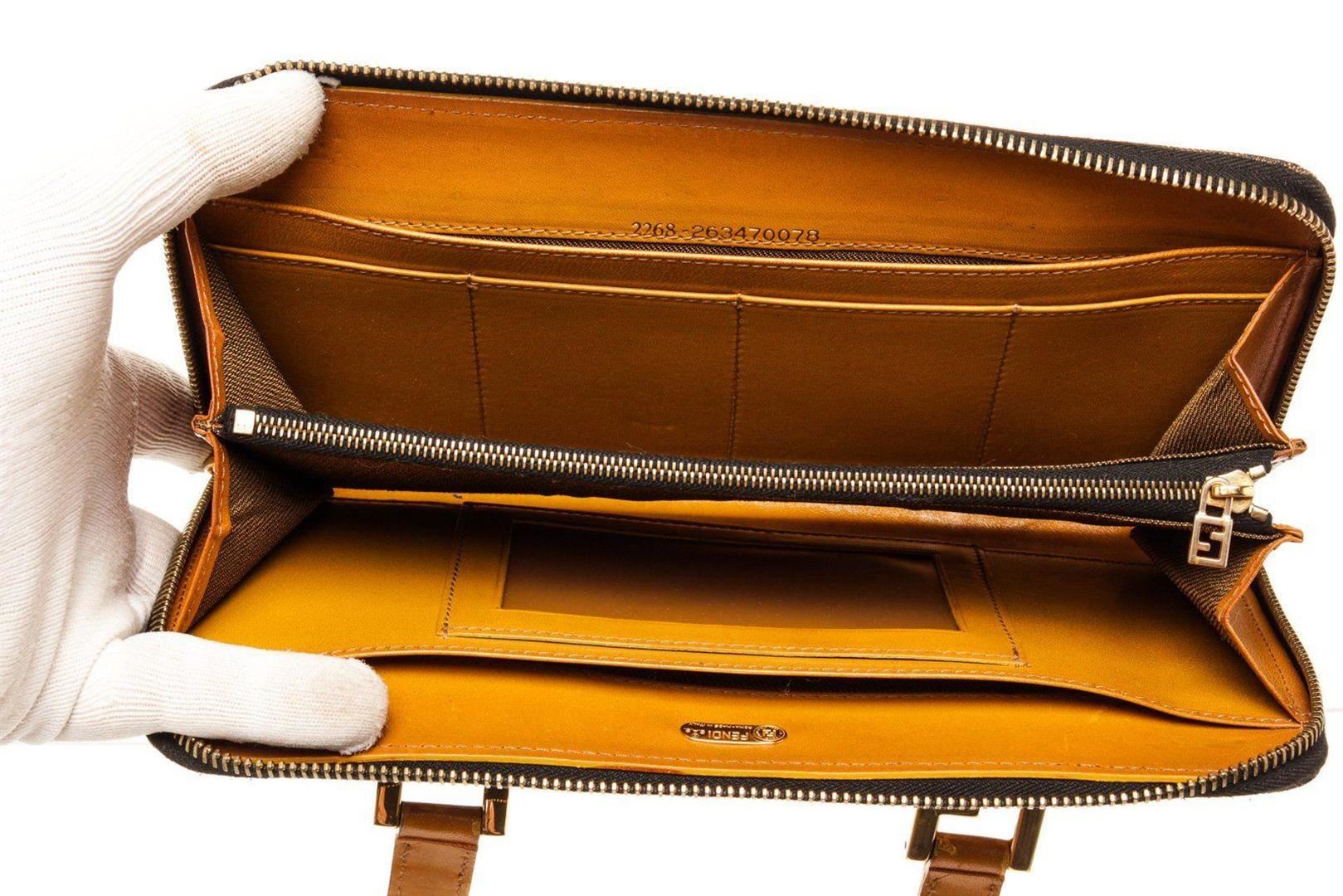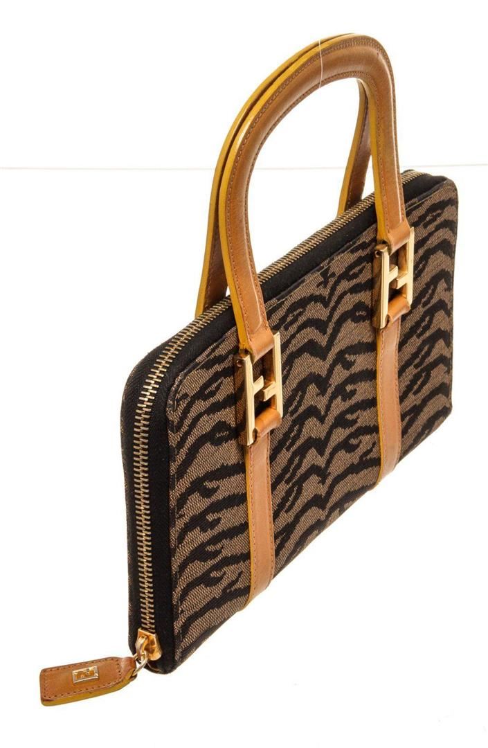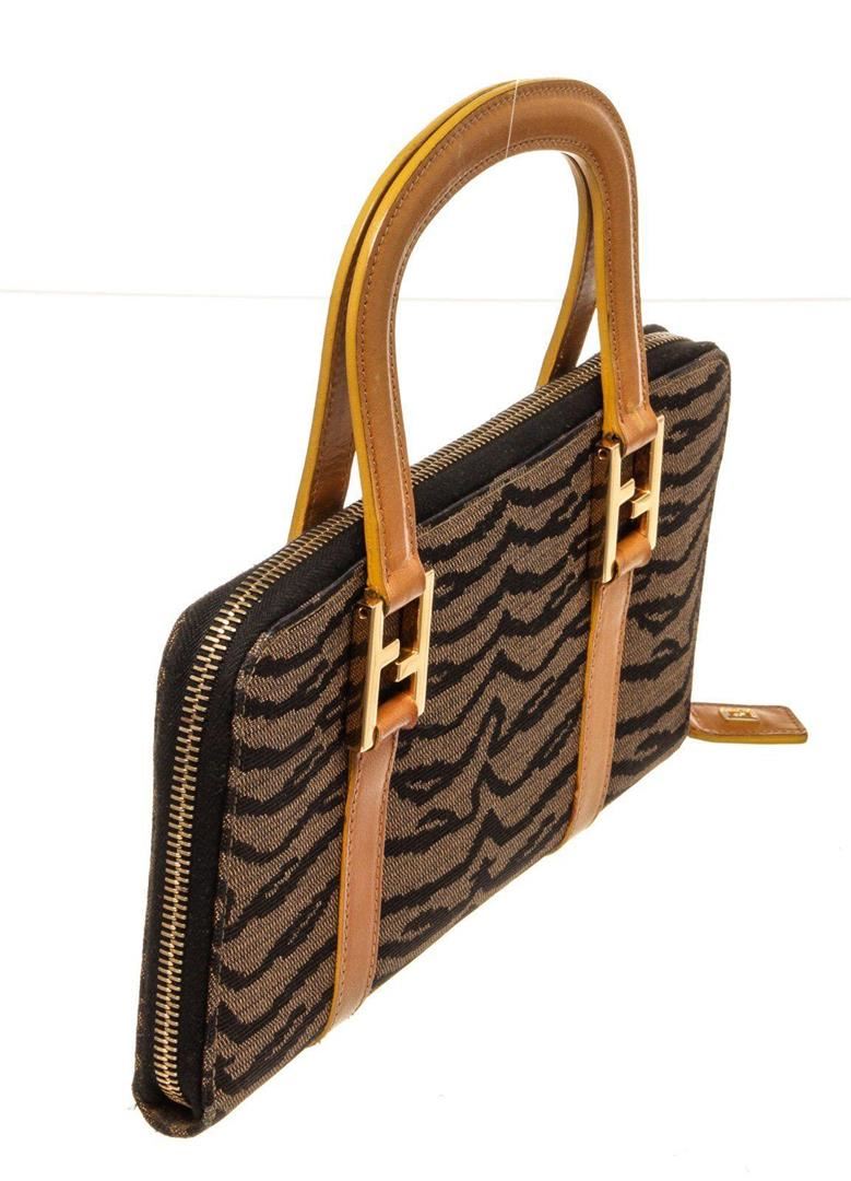 Fendi Brown Canvas Leather Top Handle Organizer with canvas body, flat leather handles, and top zip closure.