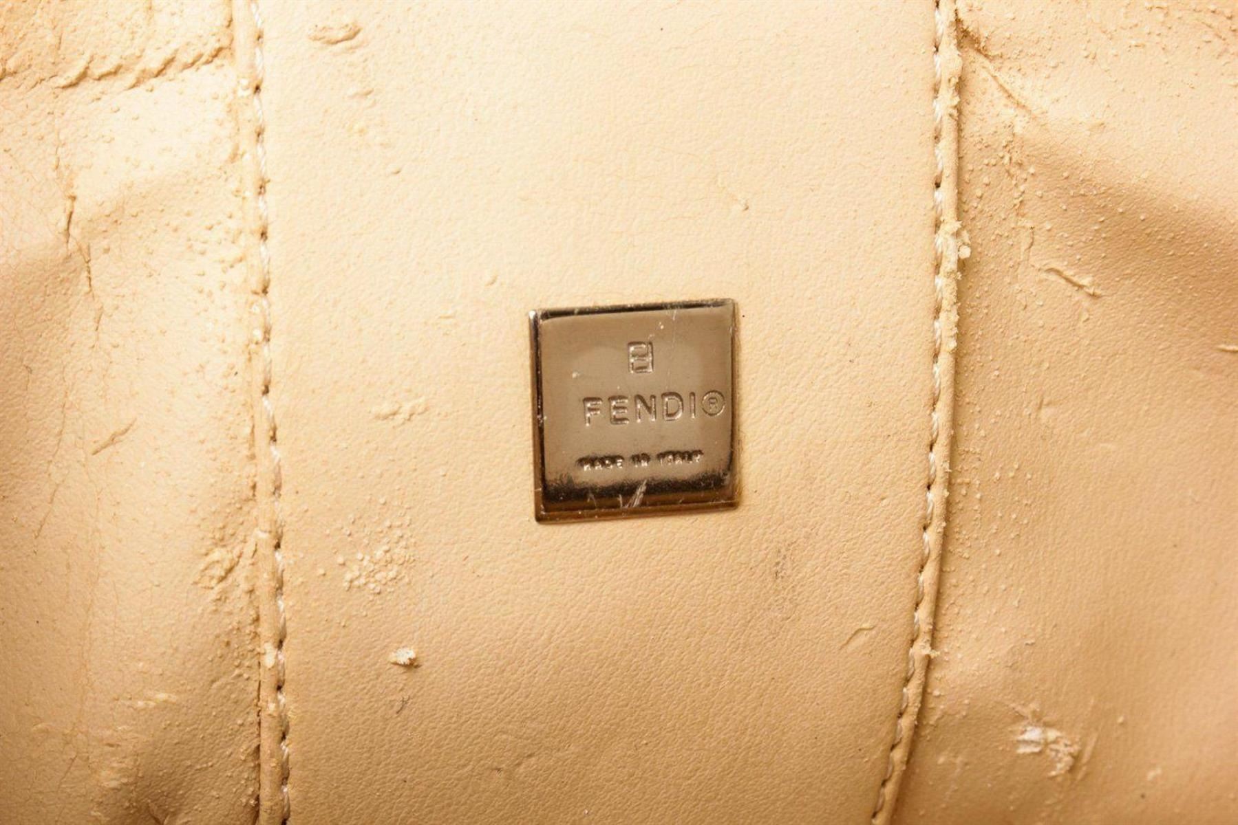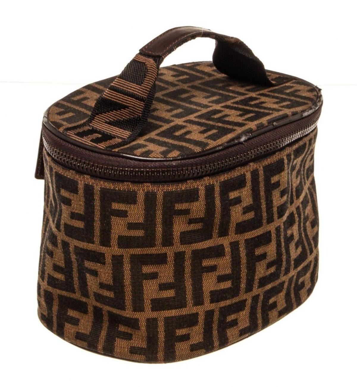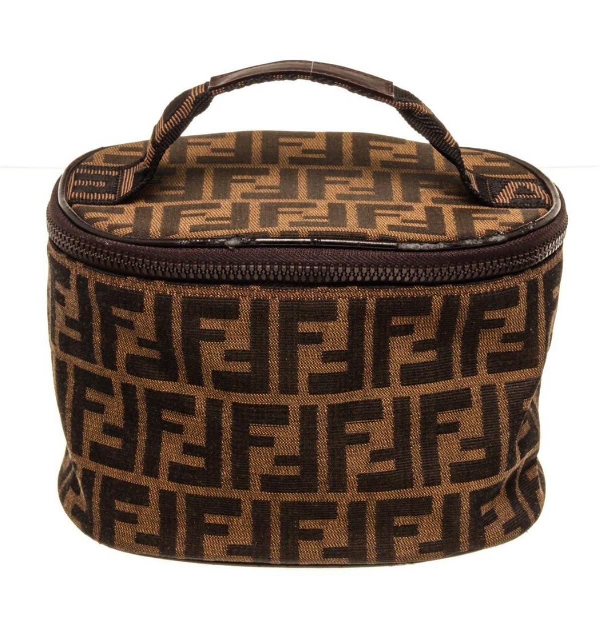 Fendi Brown Canvas Vanity Case Cosmetic Bag with material canvas, gold-tone hardware, top handle and zipper closure.