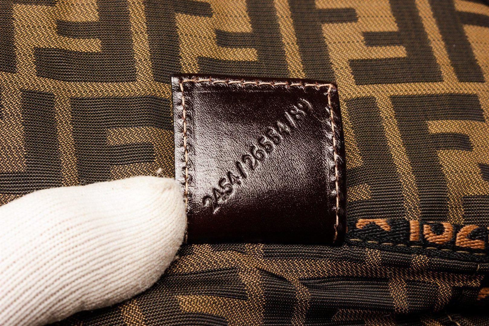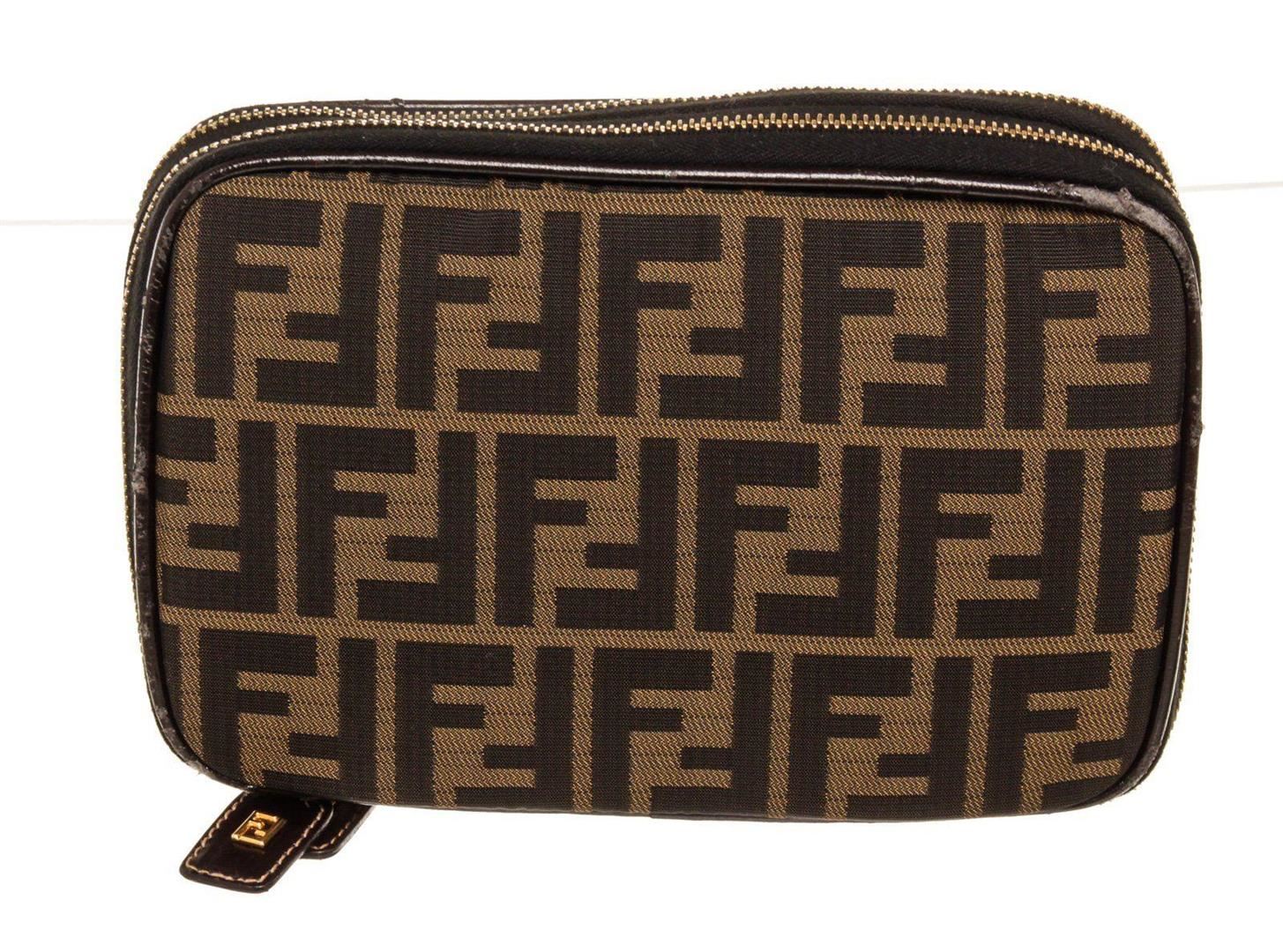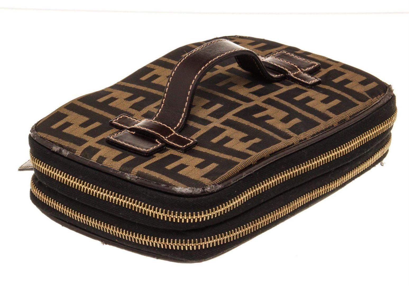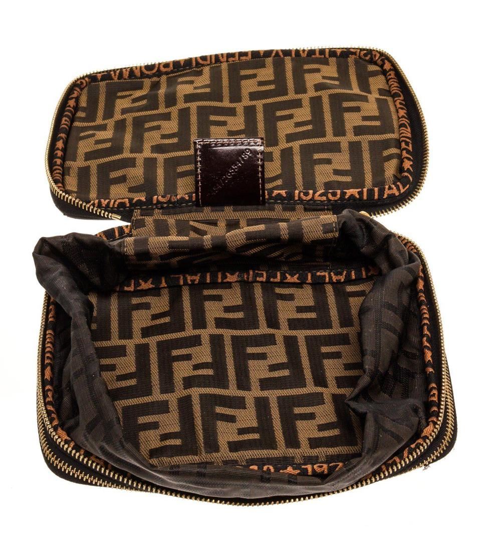 Fendi Brown Canvas Vanity Case Handbag with material leather, gold-tone hardware, top handle and zipper closure.