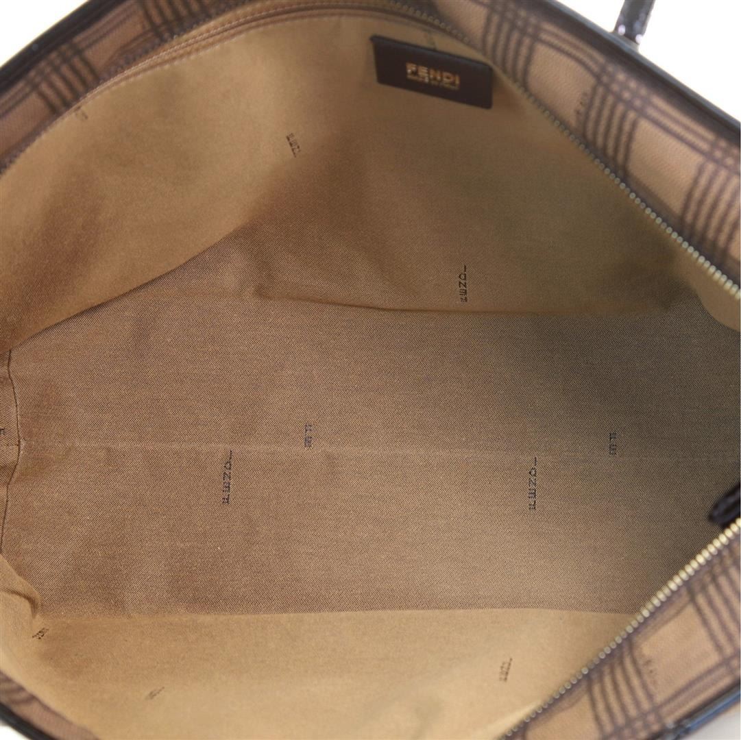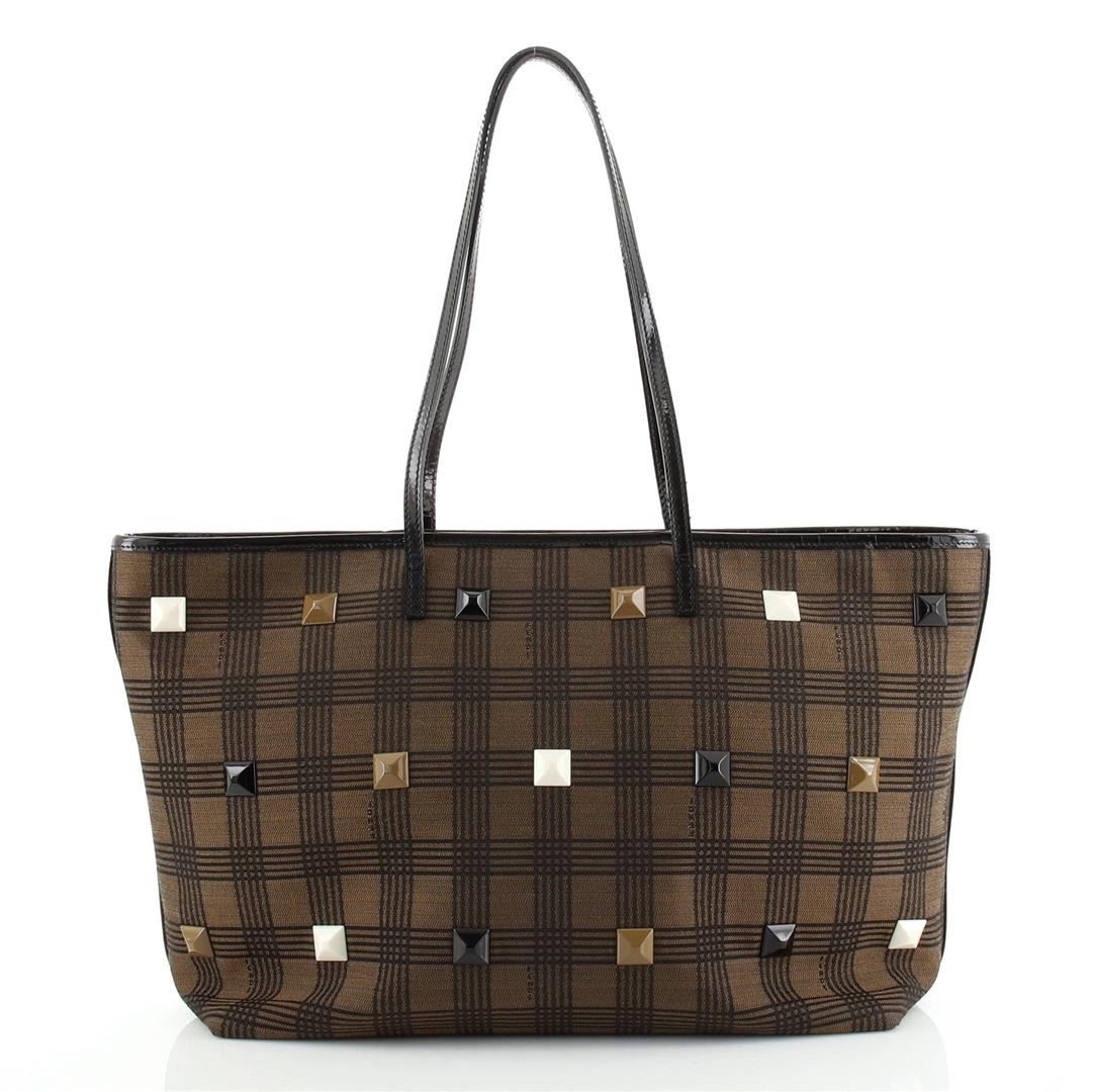 Fendi Brown Printed Canvas Studded Roll Medium Tote Bag Condition Details: Creasing on exterior and handles, moderate splitting, cracking and peeling on handle wax edges, scratches and tarnish on hardware. MMeasurements: Height 11", Width 14", D