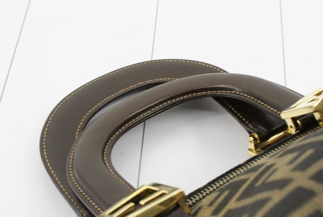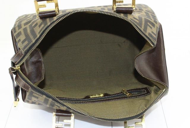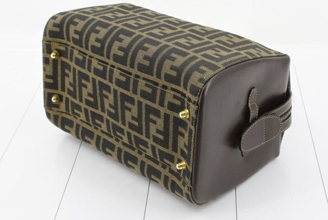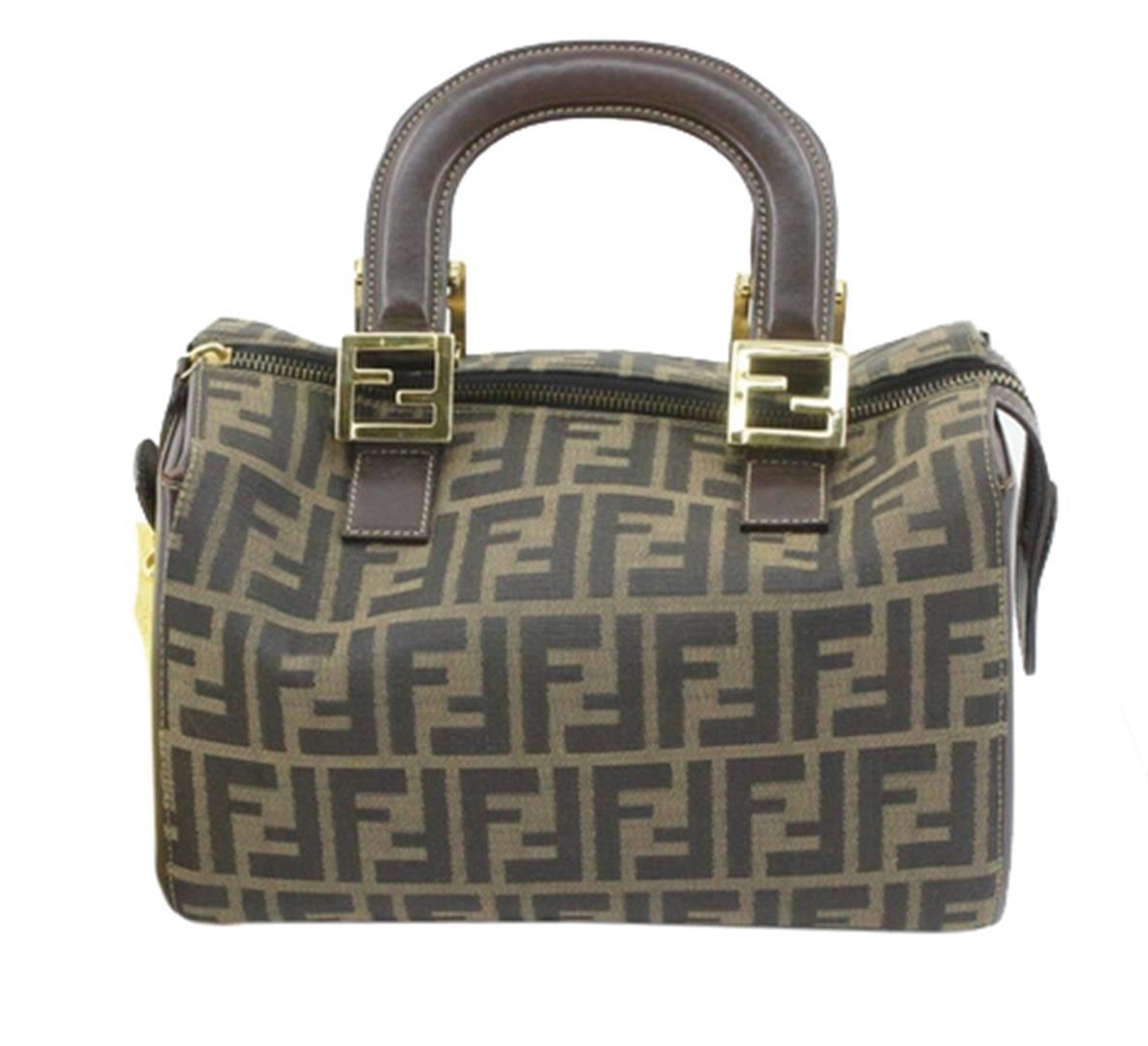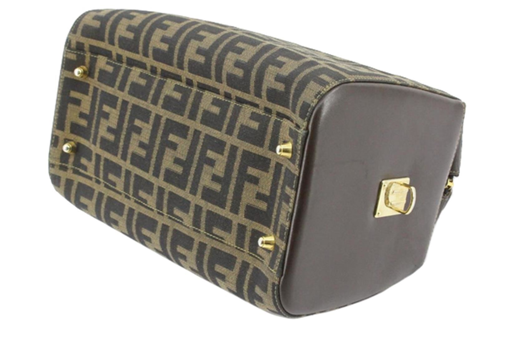 Brown Zucca printed canvas Fendi Boston small handbag with gold-tone hardware, protective feet at base, dark brown leather trim, dual flat handles, zip closure at top, brown canvas lining and one zip pocket inside. Height: 8" Width: 11.5" Depth: 5" Han