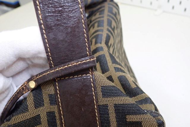 Brown Zucca print canvas Fendi vanity case with gold-tone hardware, dark brown leather trim, push-lock lock closure at top, zip closure at top of main compartment that will open to brown canvas lining and one zip pocket inside. W10.2" x H8.7" X D5.9"