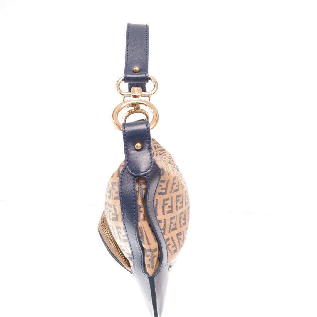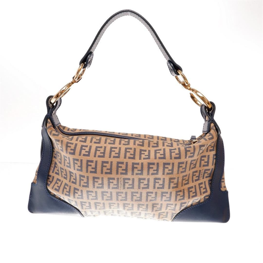 Fendi Brown Zucchino Canvas Leather Metal Round Logo Front Pocket Small Shoulder Bag. All available information is listed in the description and shown in the photos. Fendi Brown Zucchino canvas leather shoulder bag detailed with leather trimmed edges features round gold-tone metal logo, one front zipper pocket, single zip closure, top flat handle, canvas interior with a slip wall pocket, and gold-tone hardware. 12"x0.3"x6" SD:6"/30.5cmx1cmx15cm SD:15cm