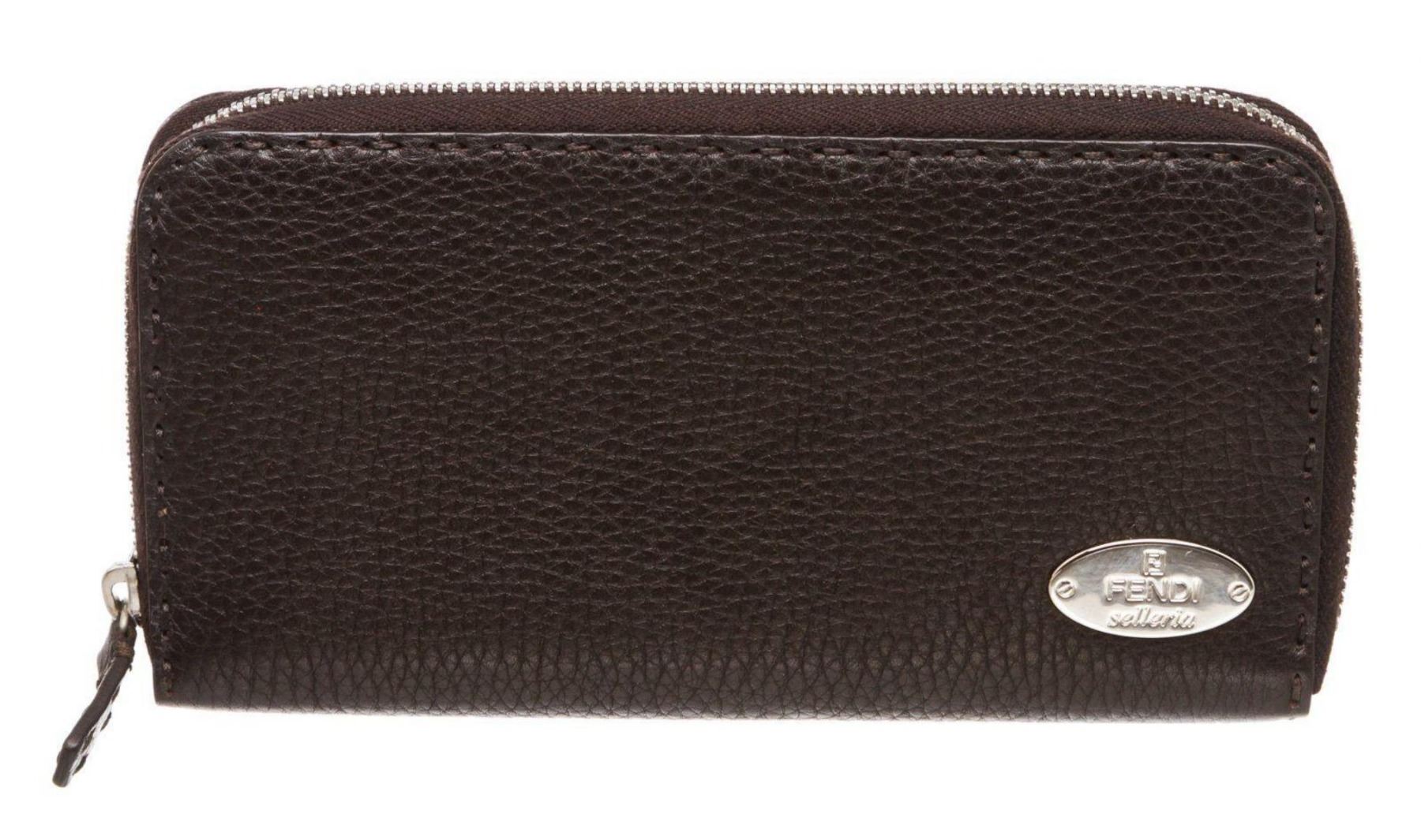 Fendi Dark Brown Salleria Leather Zip Around Wallet. Fendi Salleria dark brown leather zip around wallet with silver-tone hardware, center zip pocket, dual bill pockets, and eight card slots. Measurements: Length: 7.5 in / 19 cm Width: 1 in / 3 cm 4