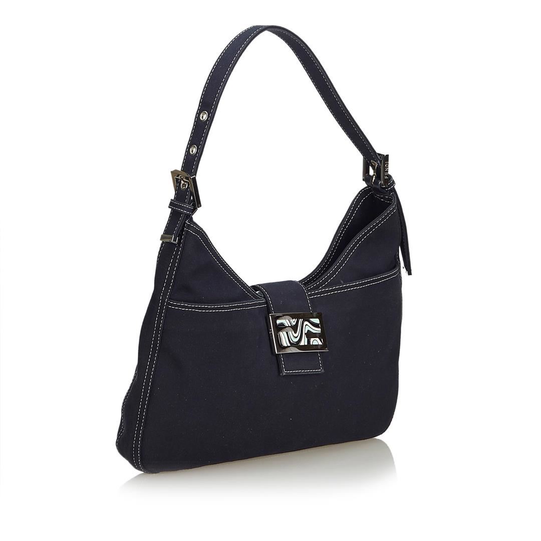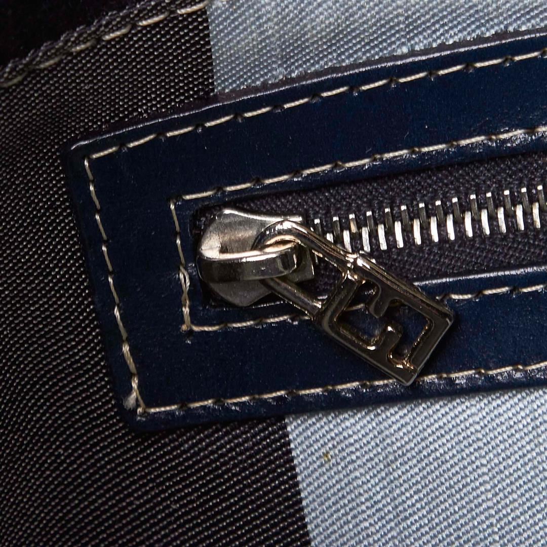 One Fendi Denim Shoulder Bag. This shoulder bag features a denim body, front exterior slip pocket, flat adjustable shoulder strap, front flap with magnetic closure, and interior zip pocket.