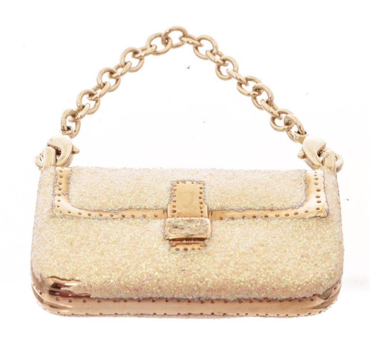 Fendi Gold Charm Glitter Shoulder Bag with gold-tone hardware, interior zip pocket, shoulder chain strap and snap closure.      Measurements:  Length: 1 in / 3 cm  4 in / 10 cm    12.75 in / 32 cmCONDITION: Pre-Owned Good overall, please see photographs for detail.