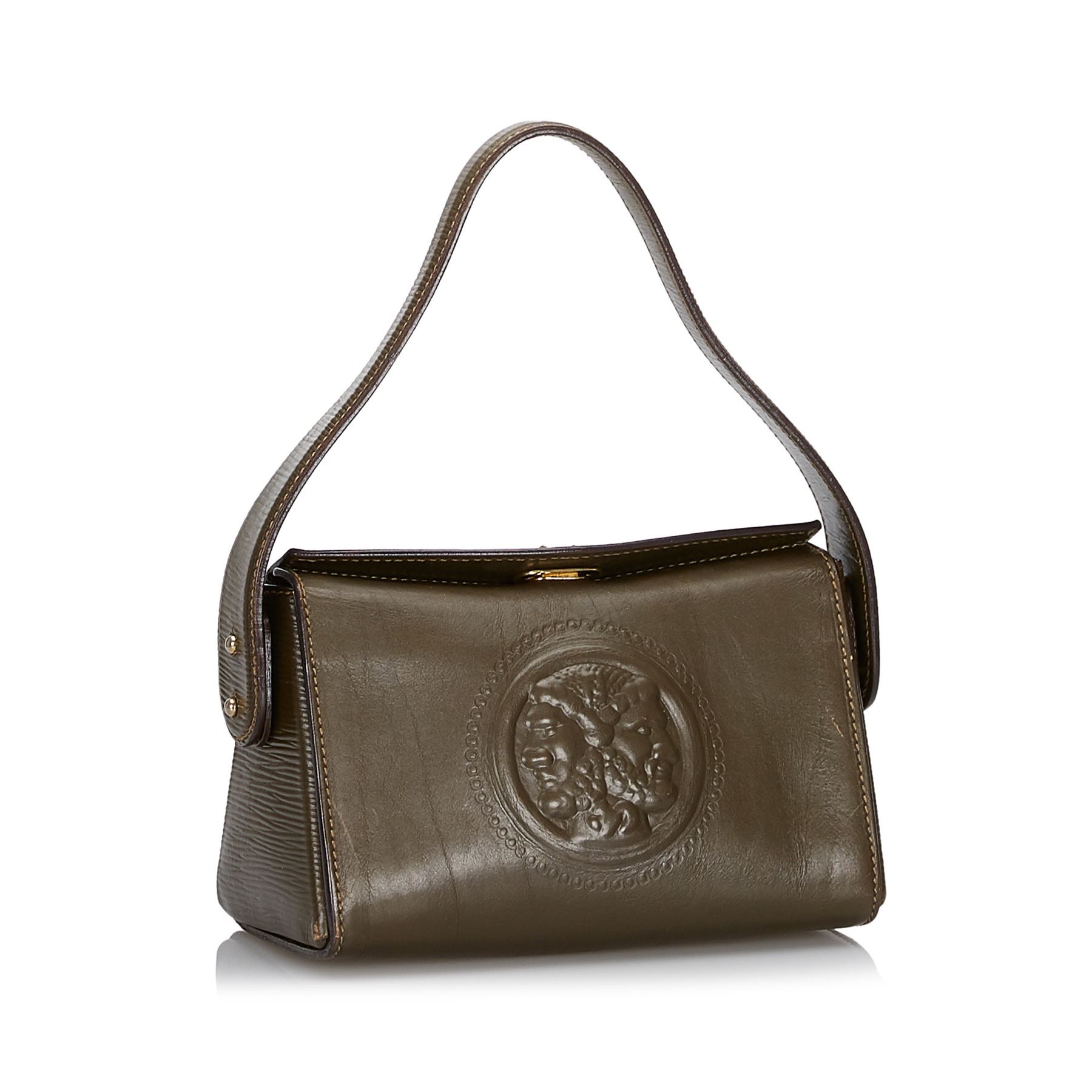This satchel features a leather body, a flat leather top handle, a detachable flat leather strap, a top fold over closure with a metal flip lock closure, and an interior zip pocket. Leather x Others Brown x Khaki Exterior front is scratched. Exterior back is scratched. Exterior handle is scratched. Exterior corners is scratched. Lock is tarnished and scratched. Size: 13 x 20 x 11 Card: NO Made in: ITALY