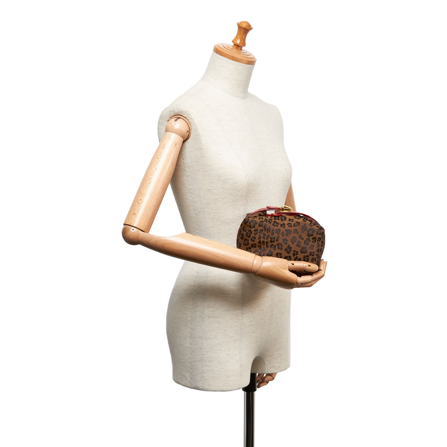 This vanity bag features a leopard print canvas body with leather trim, a top metal closure, a top zip closure, and an interior zip pouch. Fabric x Canvas x Leather x Others Brown x Brown x Dark Brown Lock is scratched. Size: 10 x 15 x 10 Card: NO Made in: Italy