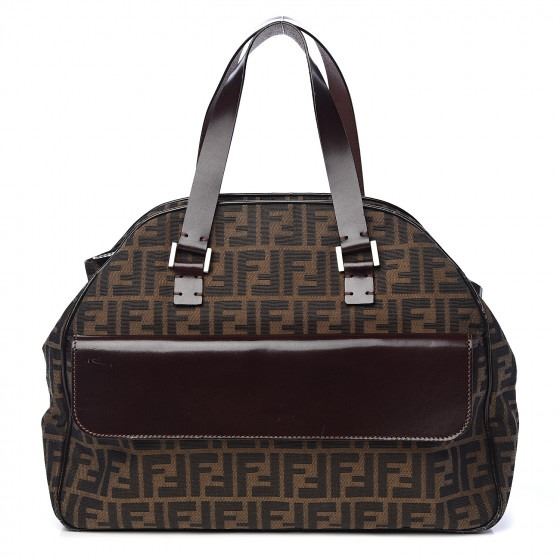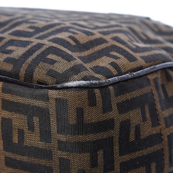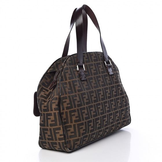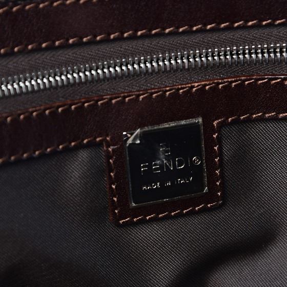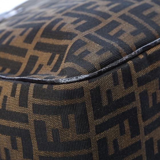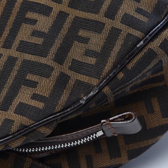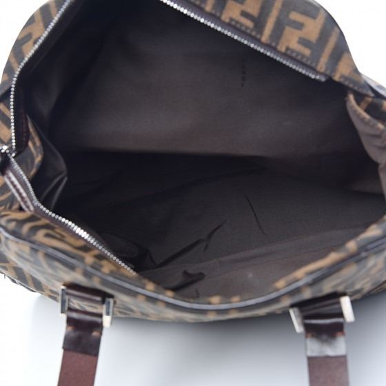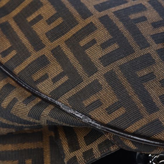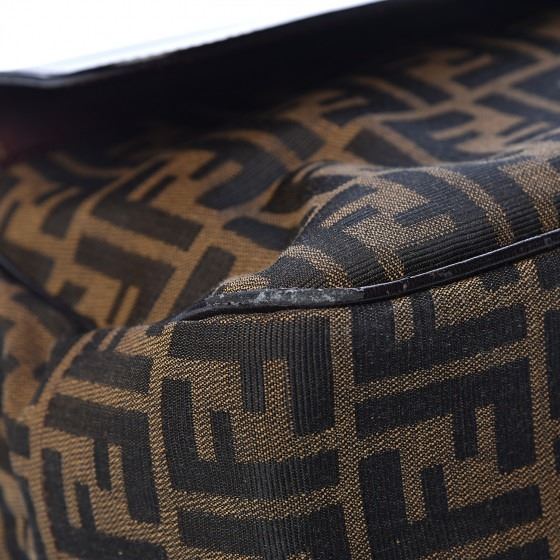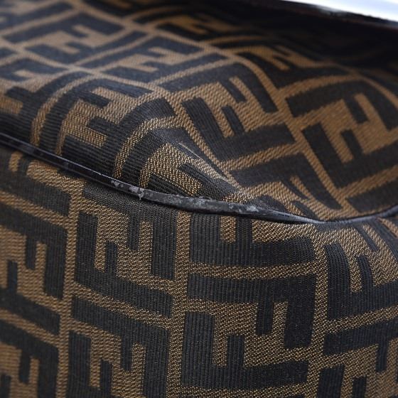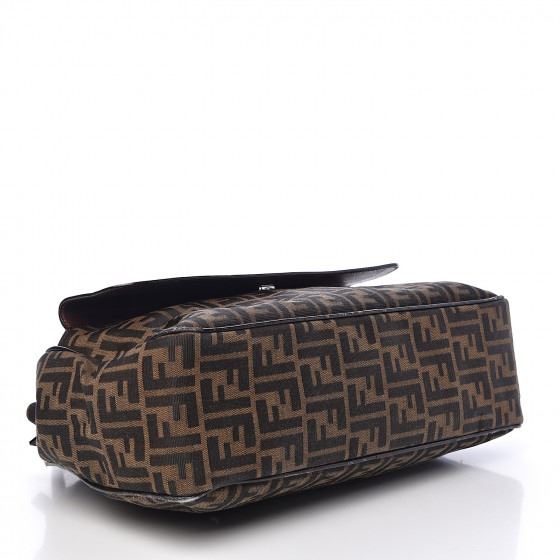 Tobacco stylish messenger bag is crafted of Fendi signature FF Zucca canvas in tobacco brown. The bag features leather shoulder straps, a front pocket and a zip top. The top opens to an espresso fabric interior with a small flat pocket .