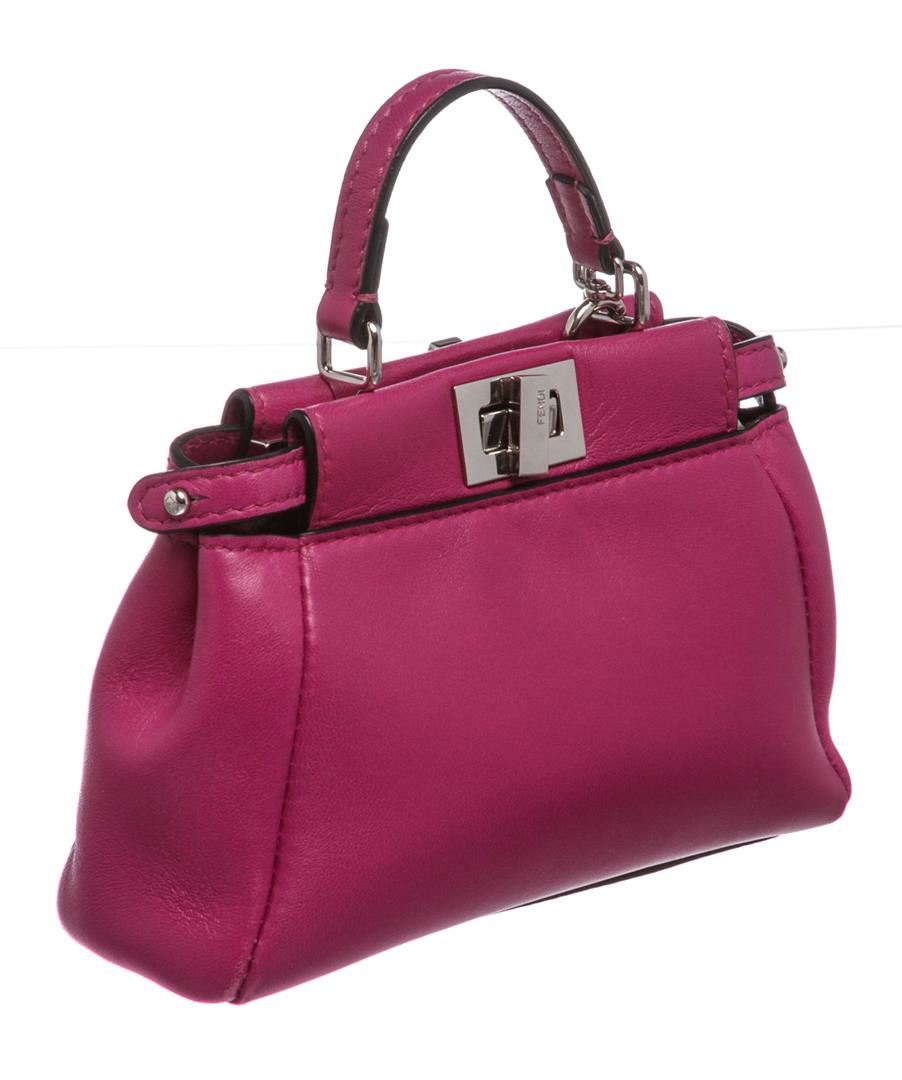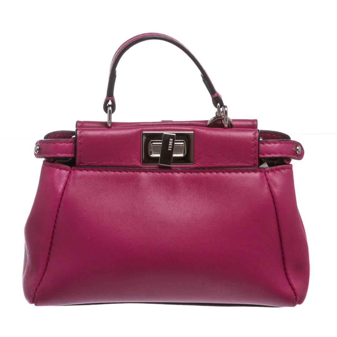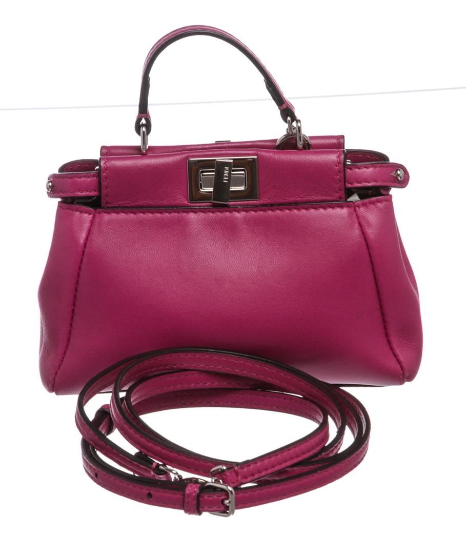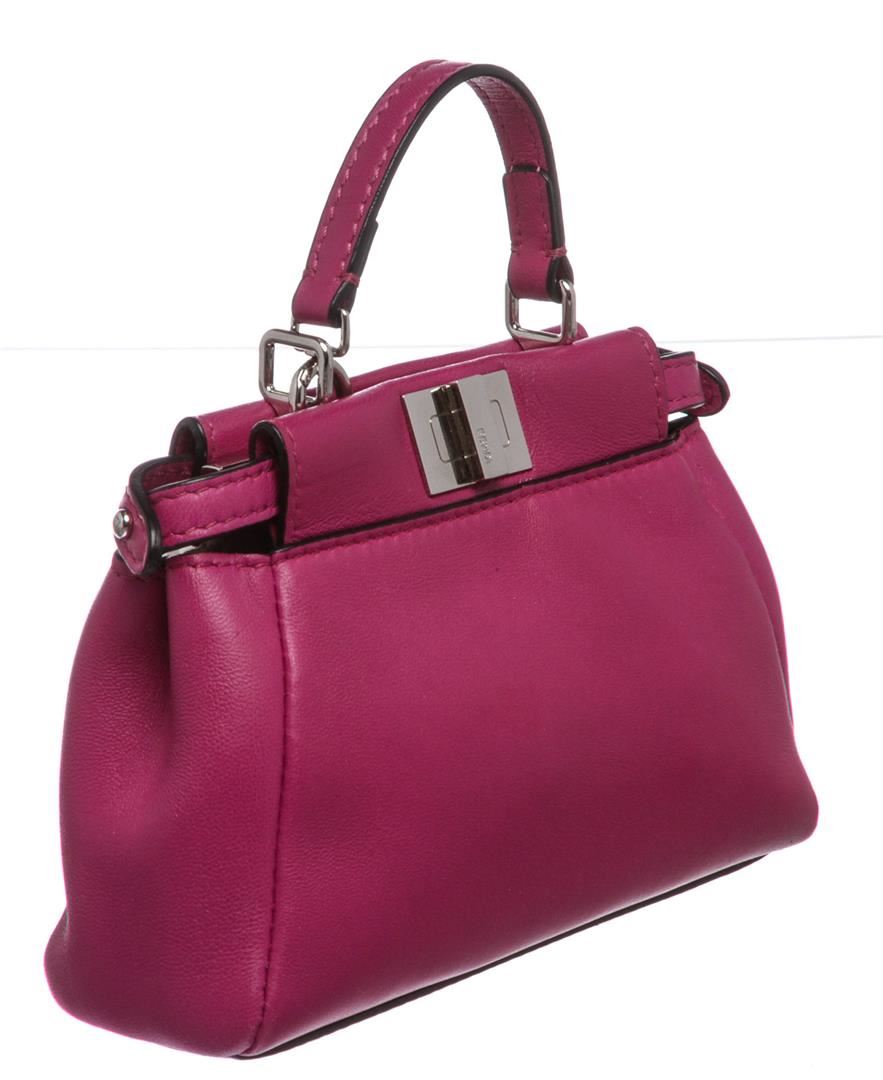 Crafted out of pink nappa leather with silver-tone hardware, flat handle rests atop, and turn lock closure. Detachable shoulder strap. Inner gray suede lining, dual inner compartments, and one side slip pocket.