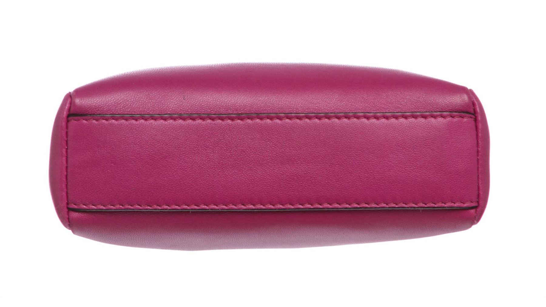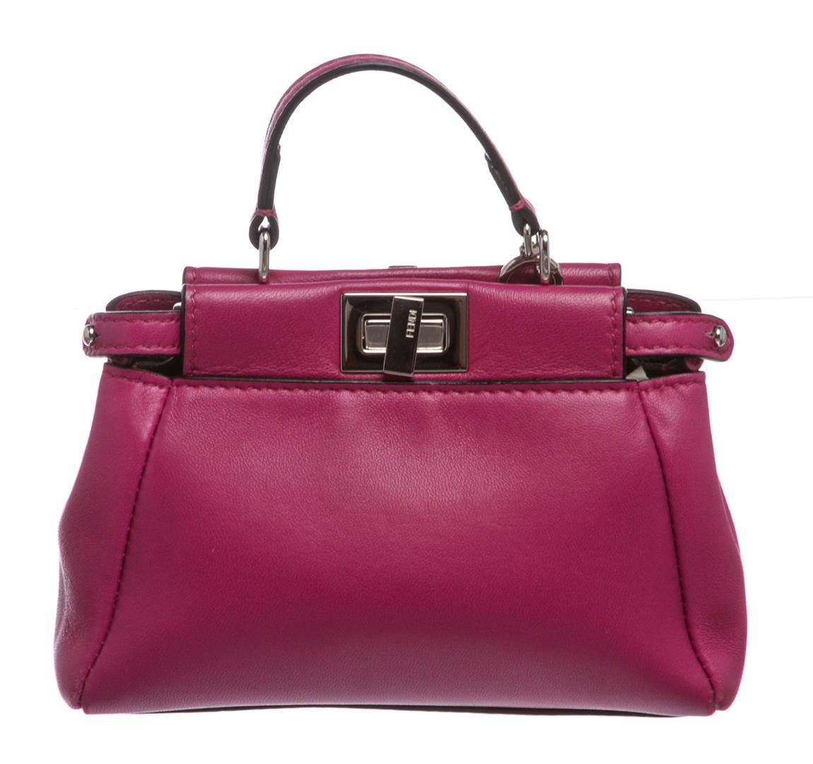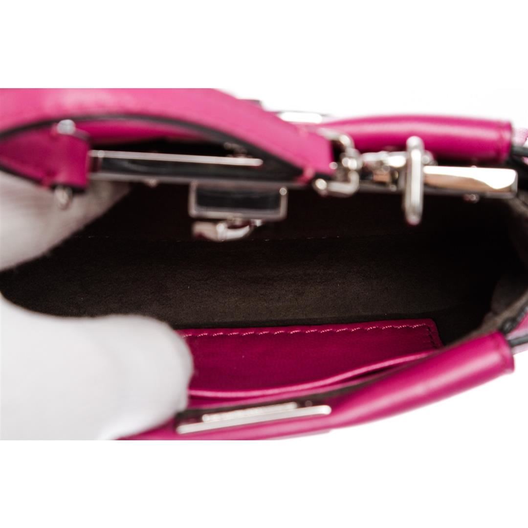 Crafted out of pink nappa leather with silver-tone hardware, flat handle rests atop, and turn lock closure. Detachable shoulder strap. Inner gray suede lining, dual inner compartments, and one side slip pocket.