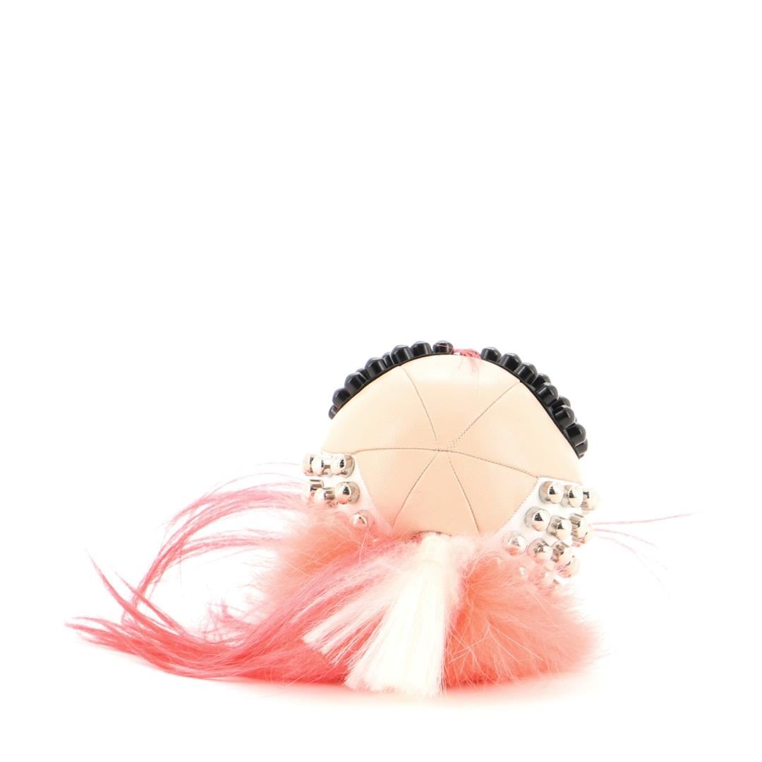 Fendi Punkito Karlito Bag Charm Studded Leather with Fur Neutral, Pink Condition Details: Minor wear and small glue stain on exterior, scratches and slight tarnish on hardware. Height 4.5", Width 8.5", Depth 4.5", Strap Drop