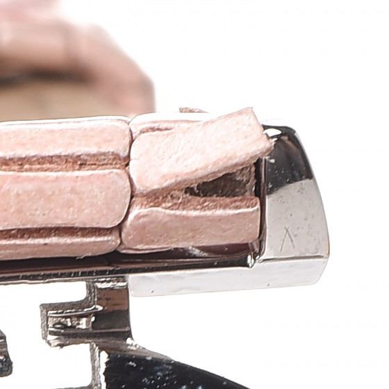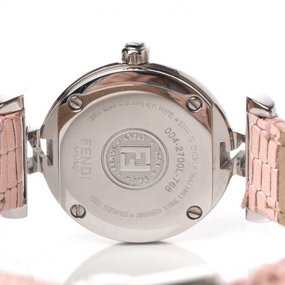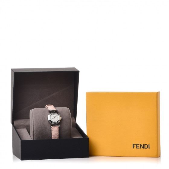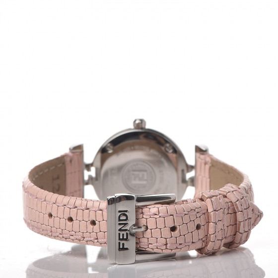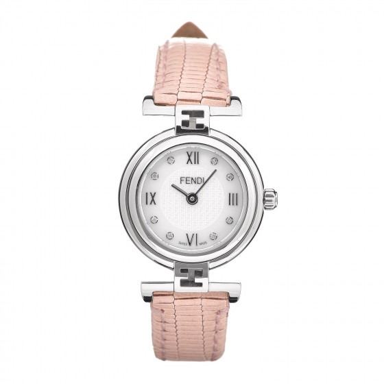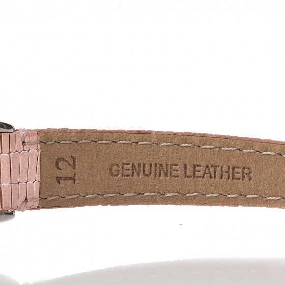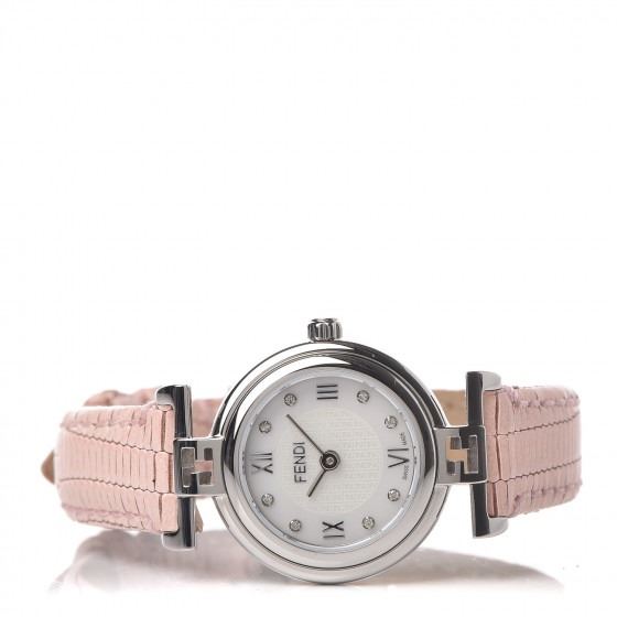Pink watch is crafted of stainless steel and a pink calfskin leather strap. Features also include a mother of pearl logo dial, Roman numeral and diamond hour markers, and Swiss quartz movement.