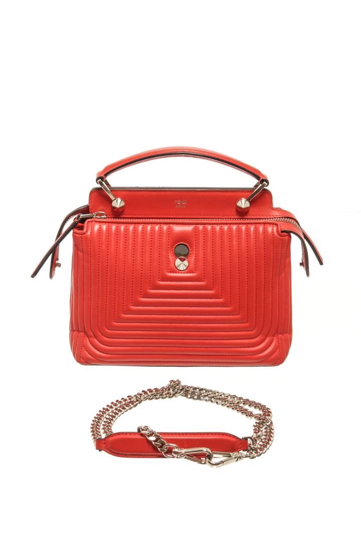 One Fendi Red Leather DotCom Click Top Shoulder Bag. Item is sold AS-IS. All available information is listed in the description and shown in the photo. Fendi Red Leather DotCom Click Top Shoulder Bag with features a flat top handle, two zip top compartments with snap ends, distinctive conical stud embellishment, silver-tone hardware, detachable strap, suede lining. Height: 6" Width: 9" Depth: 4.5", Handle Drop: 3" / 15.24 x 22.86 x 11.43 Cm