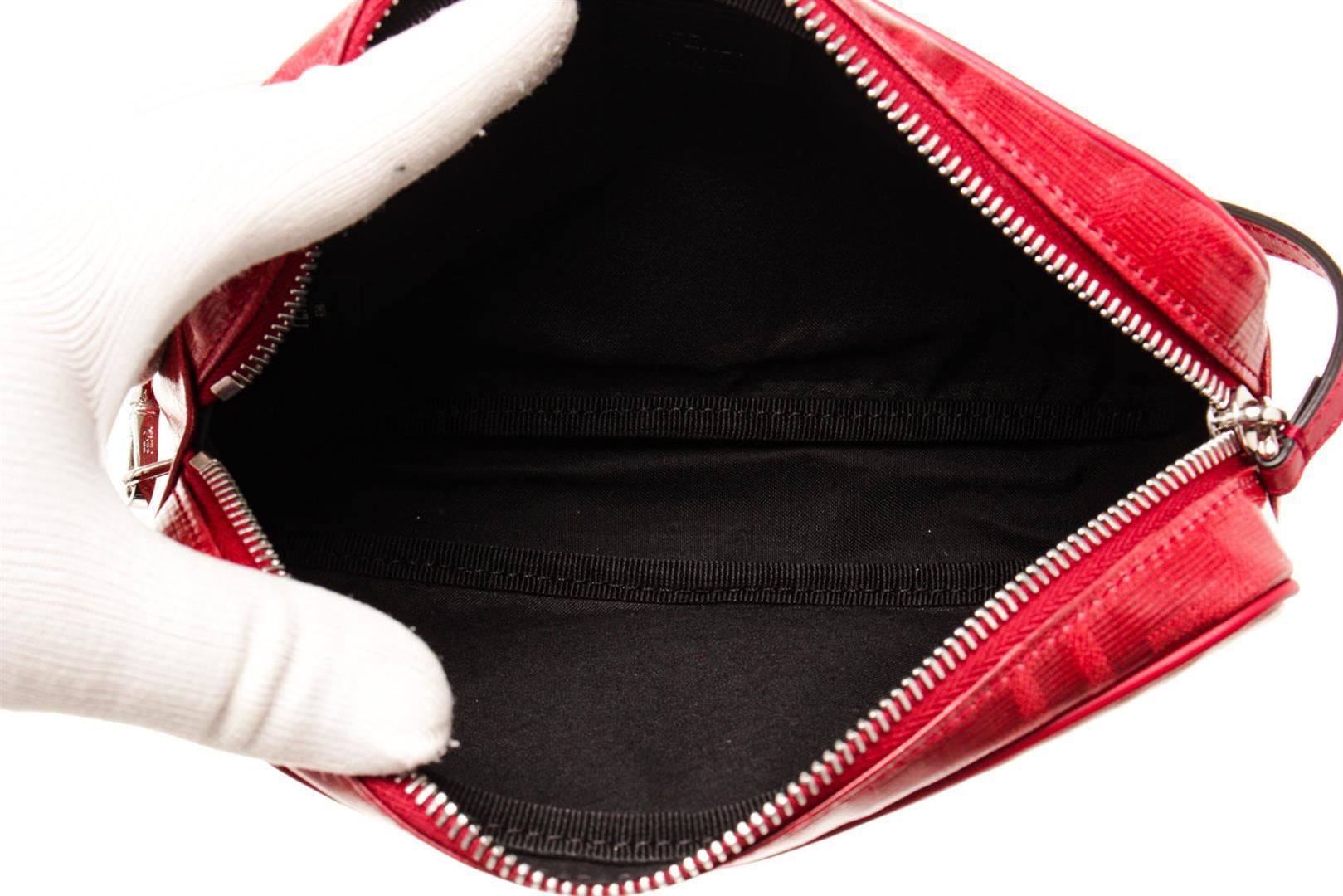 Fendi Red Leather FF Logo Stramp Crossbody Bag with leather, gold-tone hardware, trim leather, interior zip pockets, shoulder strap and flap closure.