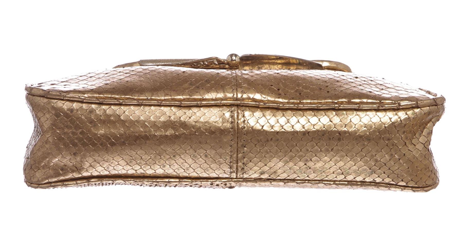 Crafted out of rose gold snakeskin, gold tone hardware,snap rhinestone closure. Inner blue satin lining and side slip pocket. Authentic.