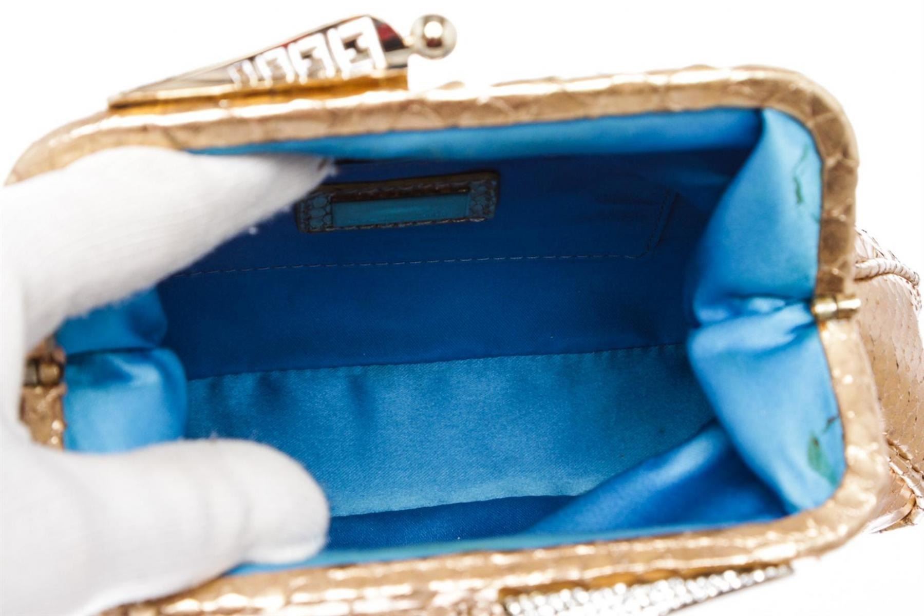 One Fendi Rose Gold Snakeskin Small Clutch Handbag. Crafted out of rose gold snakeskin, gold tone hardware,snap rhinestone closure. Inner blue satin lining and side slip pocket.