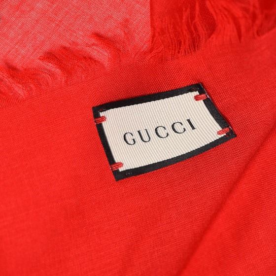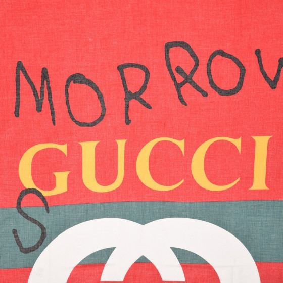 Flame scarf is crafted of 85% modal, and 15% silk. The scarf features a prominent white, green and yellow Gucci GG logo, with "Tomorrow is not Yesterday" written in black, on a red background.