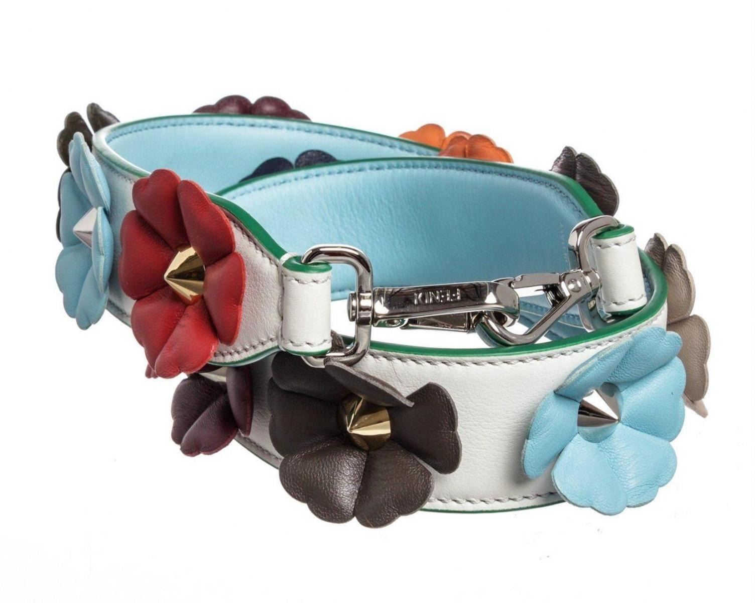 White and multicolor leather Fendi Flowerland Strap You interchangeable shoulder strap with floral appliqués featuring multicolor stud embellishments and silver-tone clasp closures. Measurements: Length: 35 in / 89 cm Width: 1.5 in / 4 cm Good overall, please see photographs for detail.