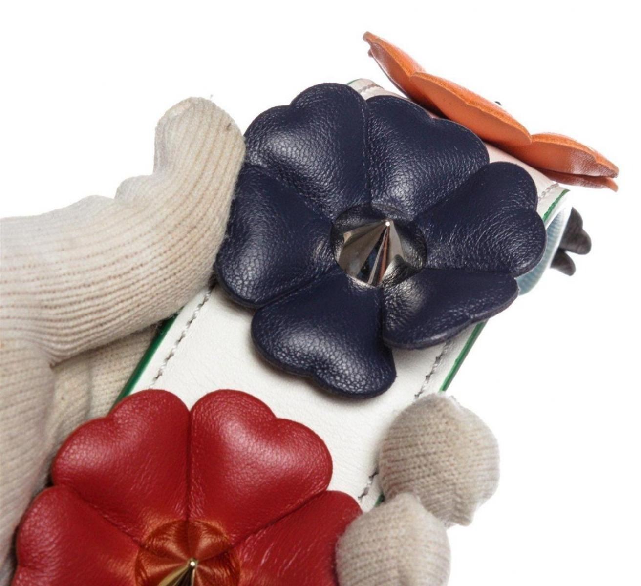 White and multicolor leather Fendi Flowerland Strap You interchangeable shoulder strap with floral appliqués featuring multicolor stud embellishments and silver-tone clasp closures. Measurements: Length: 35 in / 89 cm Width: 1.5 in / 4 cm Good overall, please see photographs for detail.