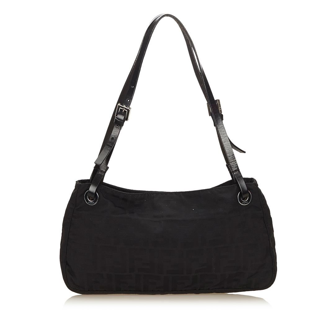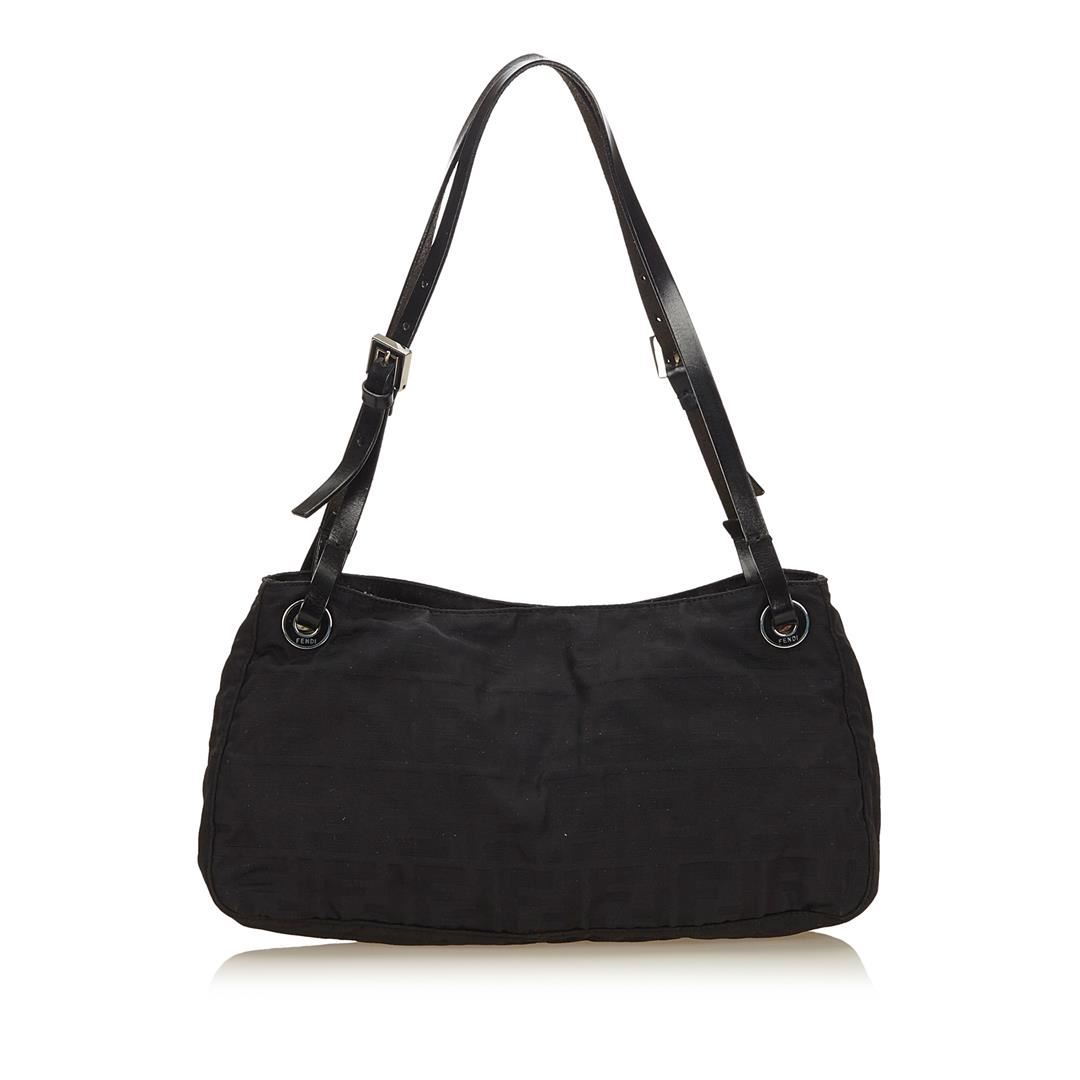 One Fendi Zucca Canvas Shoulder Bag. This shoulder bag features a canvas body, flat leather straps, open top with magnetic closure, and interior zip pocket.