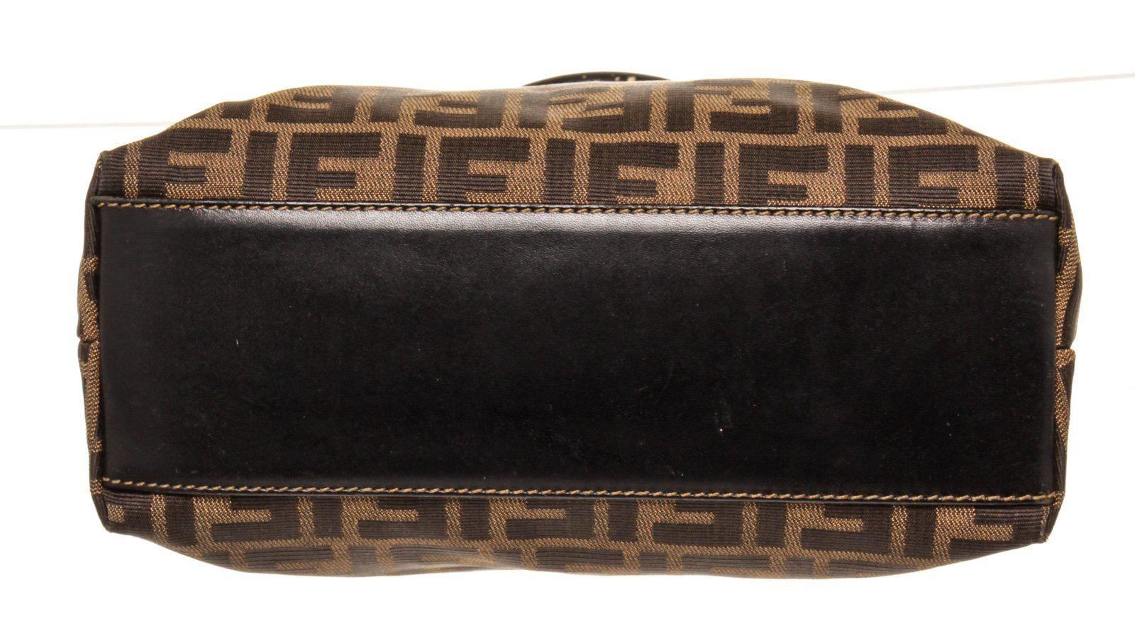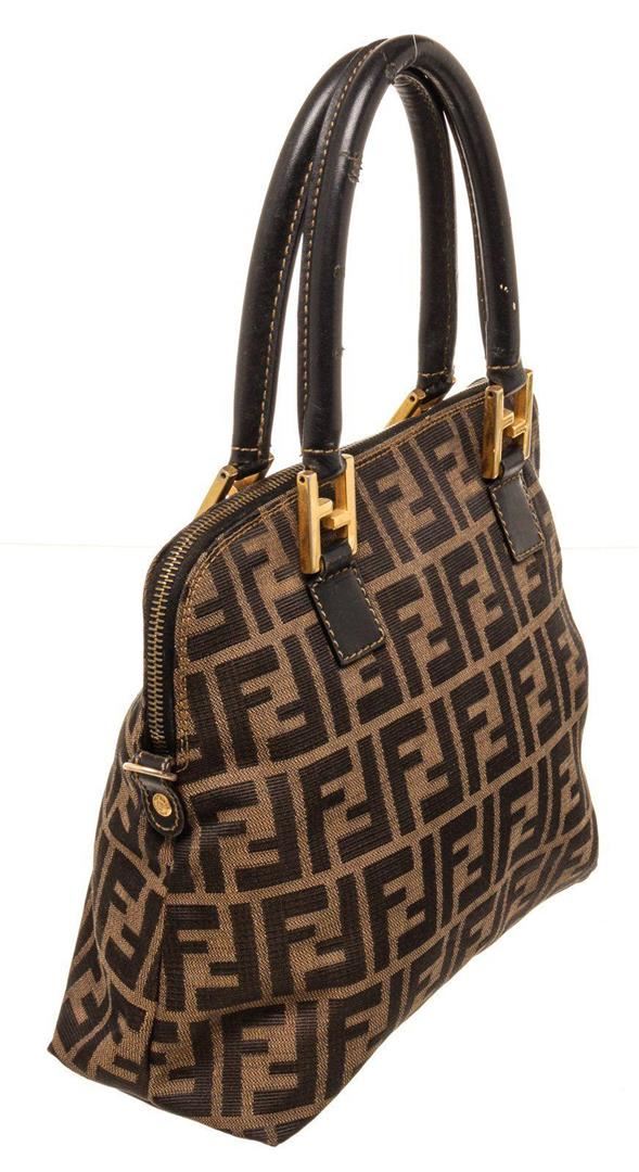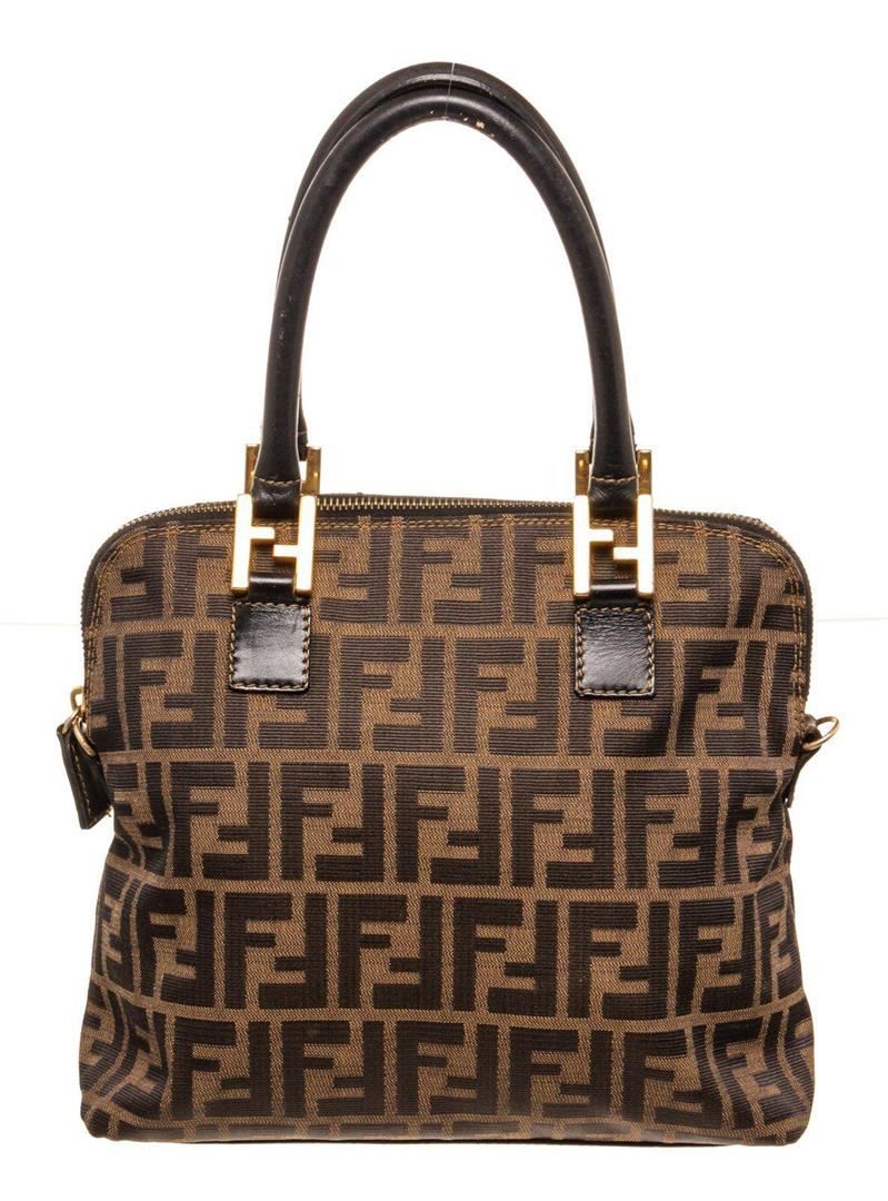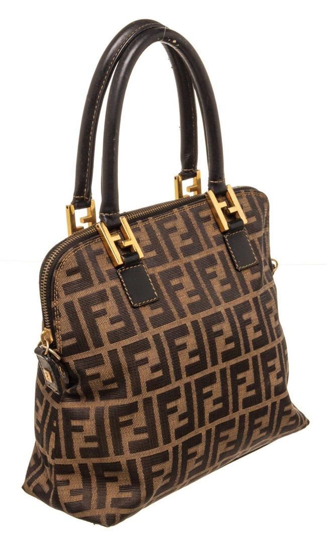Fendi Zucca Logo Brown Shoulder Bag with material canvas, gold-tone hardware, interior zip pocket, Dual top handles and Zipper closure.