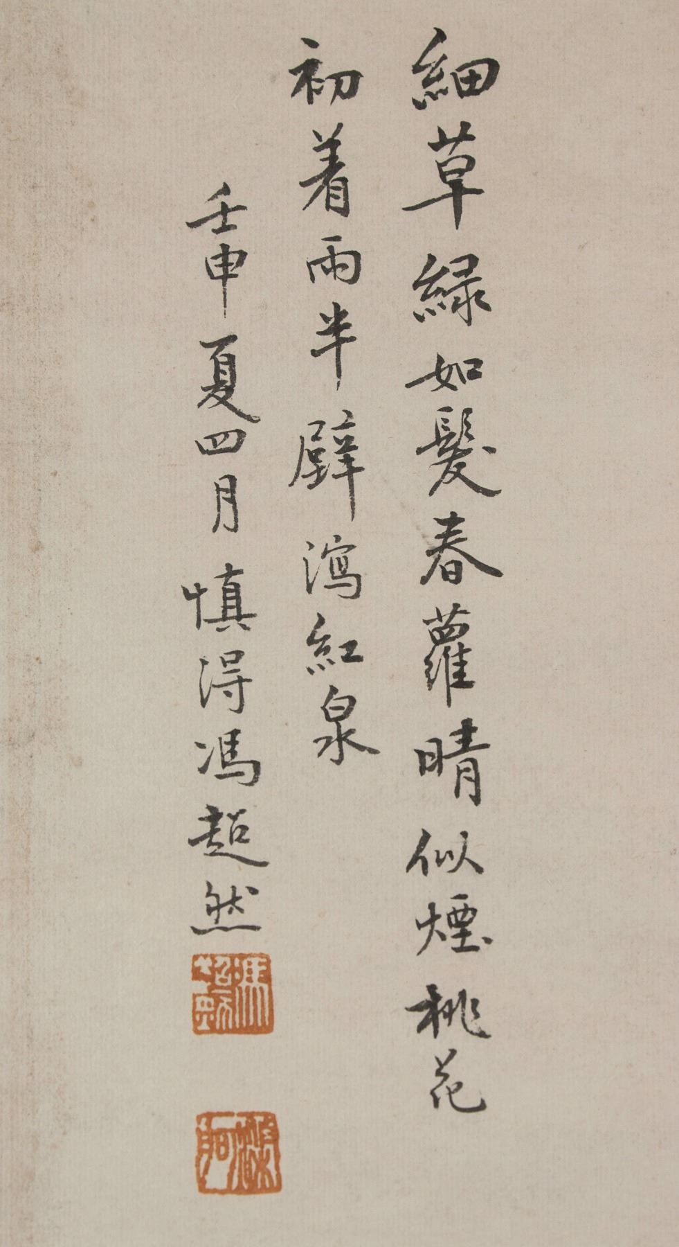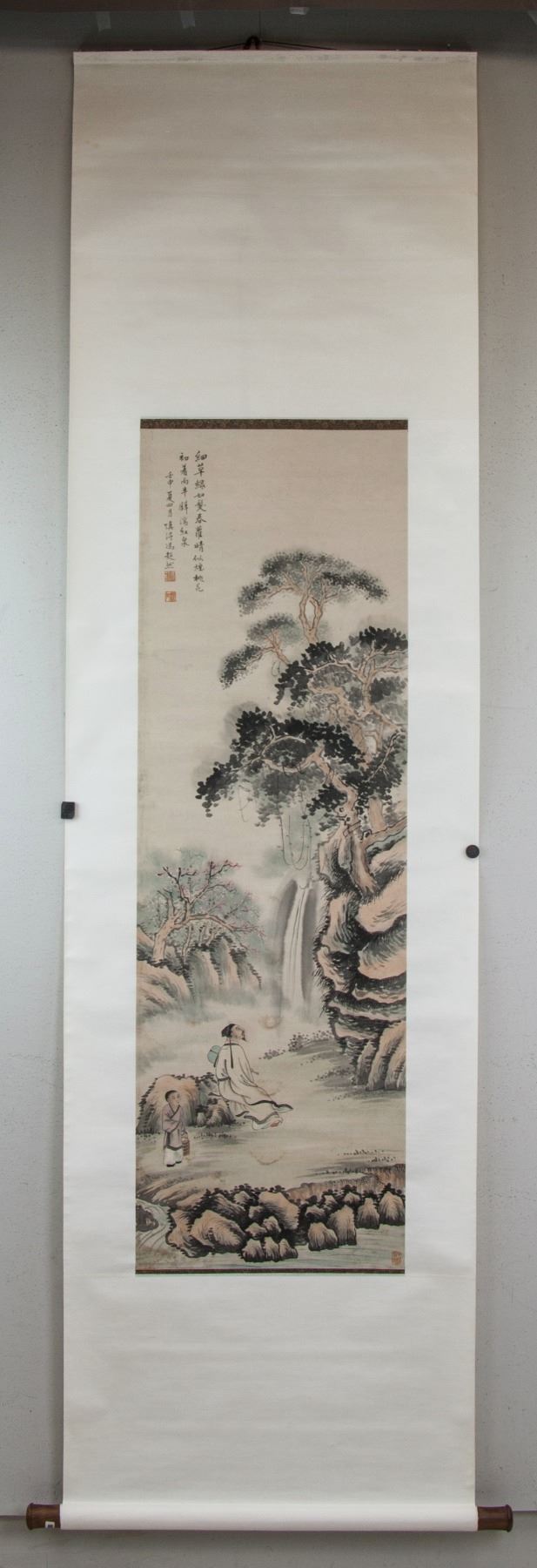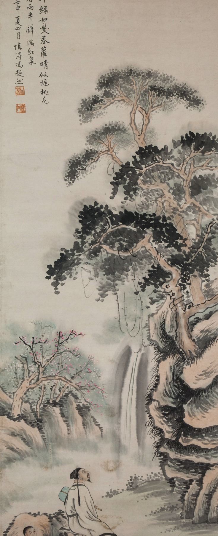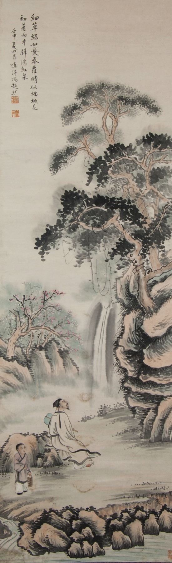 Mountainous landscape and hermit; Chines ink and watercolour on paper; hanging scroll; signed Feng Chaoran (1882-1954); inscribed with 2 artist seals; 122 cm x 38 cm