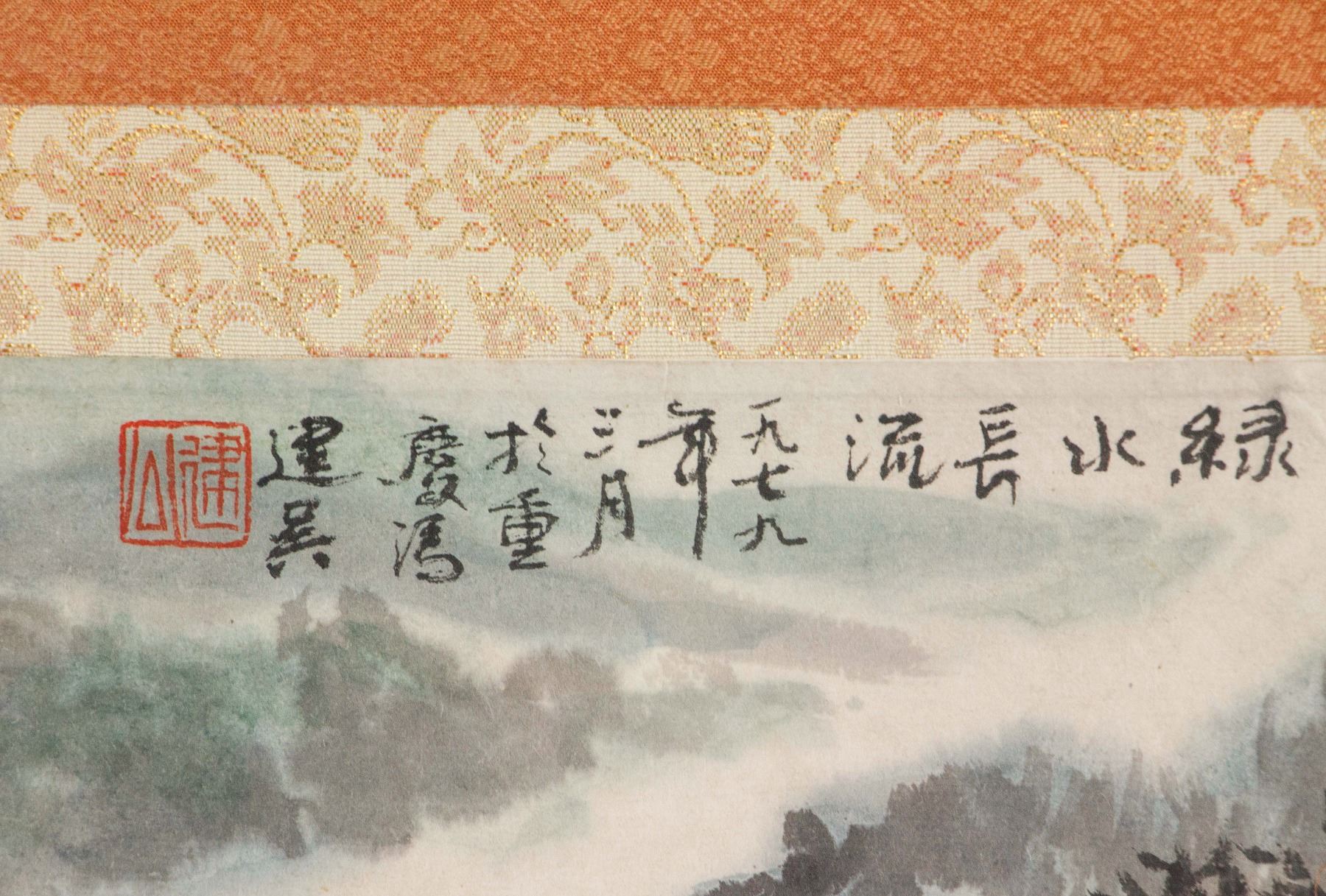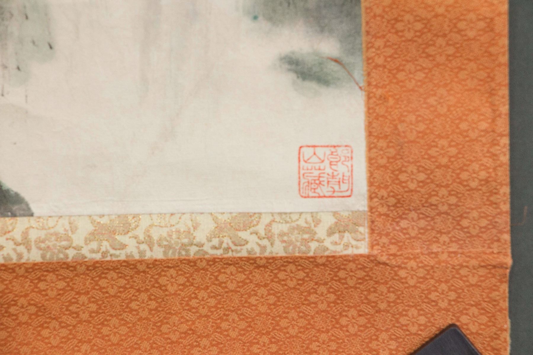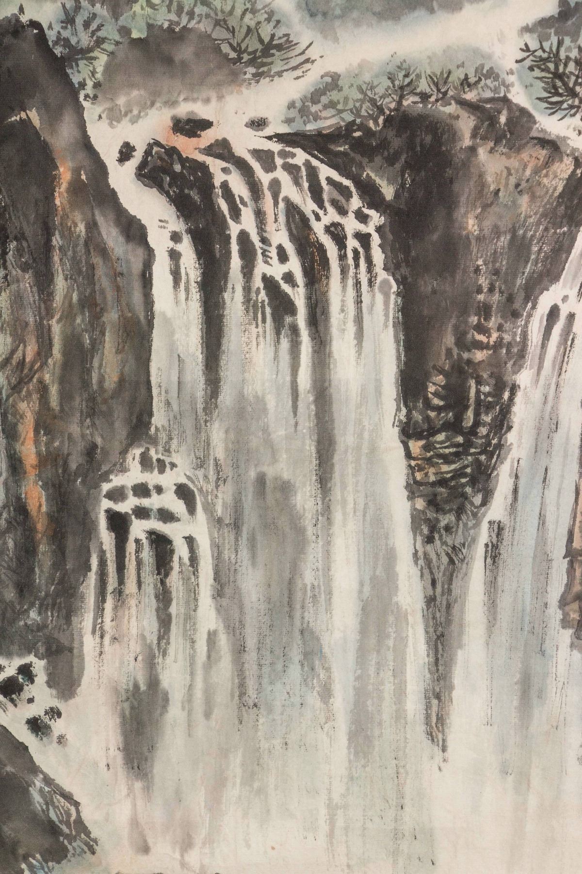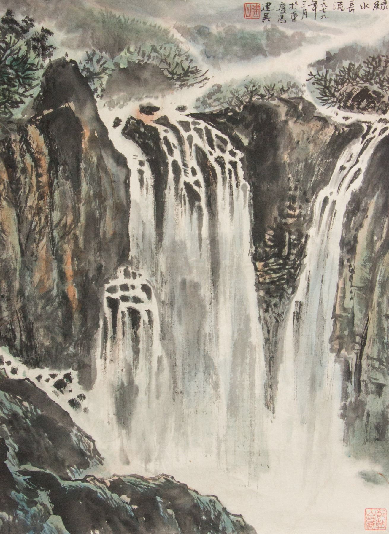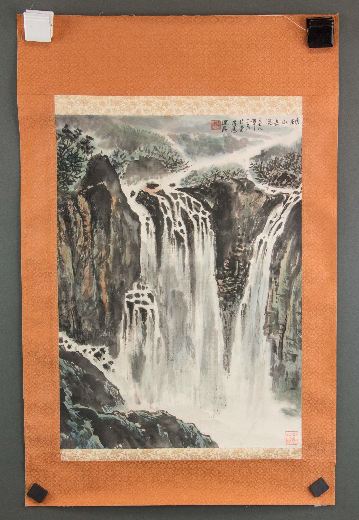 Mountainous landscape with waterfall; Chinese ink and watercolour on paper roll; signed Feng Jianwu (1910-1989); inscribed with 2 artists seals; 52.5 cm x 34.5 cm