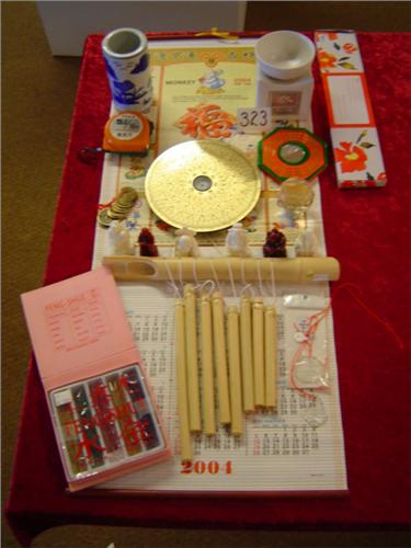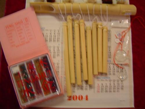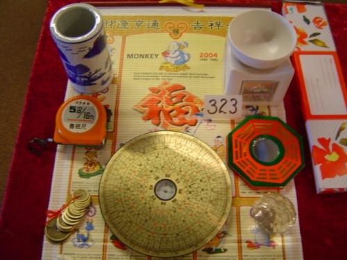 Help bring balance and harmony to your home, office or vehicle with this thirty-six piece Feng Shui Collection. 6.5" (round wood with brass plate face) Feng Shui Compass, Feng Shui Tape Measure, 4" Ba Gua Mirror, 2" Faceted Crystal Ball with stand, hanging 1.5" Crystal with Yin Yang design on red cord, hanging 1.75" crystal with Quan Yin design on red cord, 18 piece set of assorted size Feng Shui Coins, six pieces assorted 2" (red and ivory pourstone) Ho Tai Buddhas, Feng Shui Bamboo Windchime (8-tube), 4" white porcelain Essential Oil Diffuser with Chinese Water Symbol, 5" blue/white porcelain bamboo pot with oriental scene, Zodiac Design Wall Calendar and Feng-Shui incense
