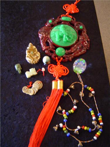 Help bring balance and harmony to your home, office or vehicle with this twenty-six piece Feng Shui Collection. 3.75" Gold Finish Quan Yin, 9" Chinese Lucky Tie (red pourstone with Chinese Symbols and 4.5" Jade pourstone center with Elephant), 18 piece set of assorted size Feng Shui Coins, 45" bell string with traditional glass beads and minni brass bells, 2.75" carved Jade Dragon, 1.75" carved Jade Dragon Turtle, 1.5" hand-painted Jade Egg with stand and 2.25" Cut Crystal with Ship and Chinese Symbol design (rainbow color and half pineapple shape).