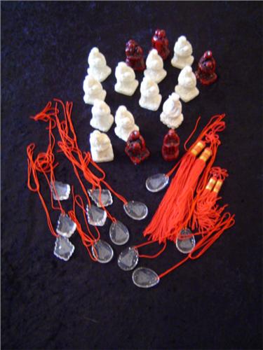 Help bring balance and harmony to your home, office or vehicle with this thirty-six piece Feng Shui Collection. Twelve hanging 1.5" Crystal with Yin Yang design on red cord, two small lucky knot red tassels, sixteen pieces assorted 2" (red and ivory pourstone) Ho Tai Buddhas (mostly prosperity and fertility),