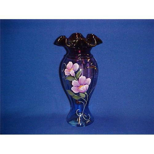 Fenton Art Glass Mulberry Medley 8 1/2" Vase....The elusive Mulberry color returns in all its shaded beauty . A favorite canvas for Kim Barley , Mulberry emerges when a small amount of gold ruby glass is covered with azure blue and carefully blown, shading smoothly from magenta to blue . Each vase will very , just as the changing colors of ripening mulberries . Kim designed a colorful wild anemone growing amidst 22k golden berries . A gold dragonfly with Swarovski stones swoops in to experience the heady aroma of a newly opened bud . #671 of 1250