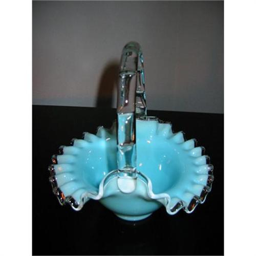 This gorgeous 8 inch handblown Fenton ruffled basket has a beautiful clear glass designed handle in gorgeous torquoise blue color. It is 7.5 inch wide with 4.5 inch deep. This basket is in excellent conditions. Something to think about.