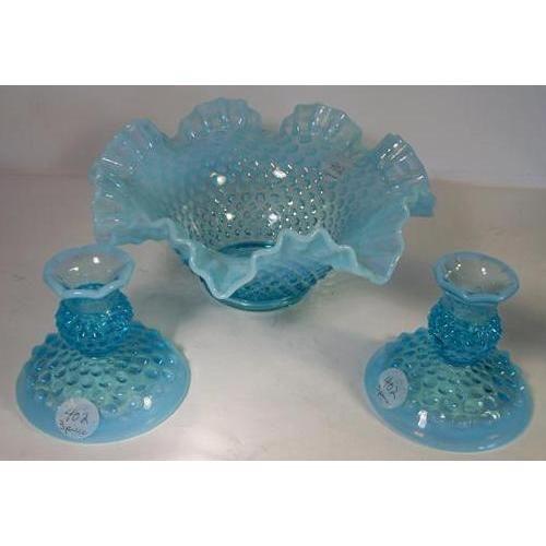 Fenton Blue opalescent hobnail Buffet set ruffled crimped bowl and 2 candle holders 10x 4