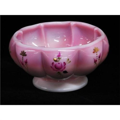 Fenton Charleton Collection Handpainted Rosalene HP Melon Rose Bowl, Ca. 2003. Pink hand decorated footed bowl with 22K gold accents. Marked "Charleton Collection 2003, Fenton 0" Signed "Dan Fenton", Signed by artist "handpainted by M. Nutter", Maker mark "J.T.". 3 1/4 H x 6 1/2 D. Condition: no damage noted.