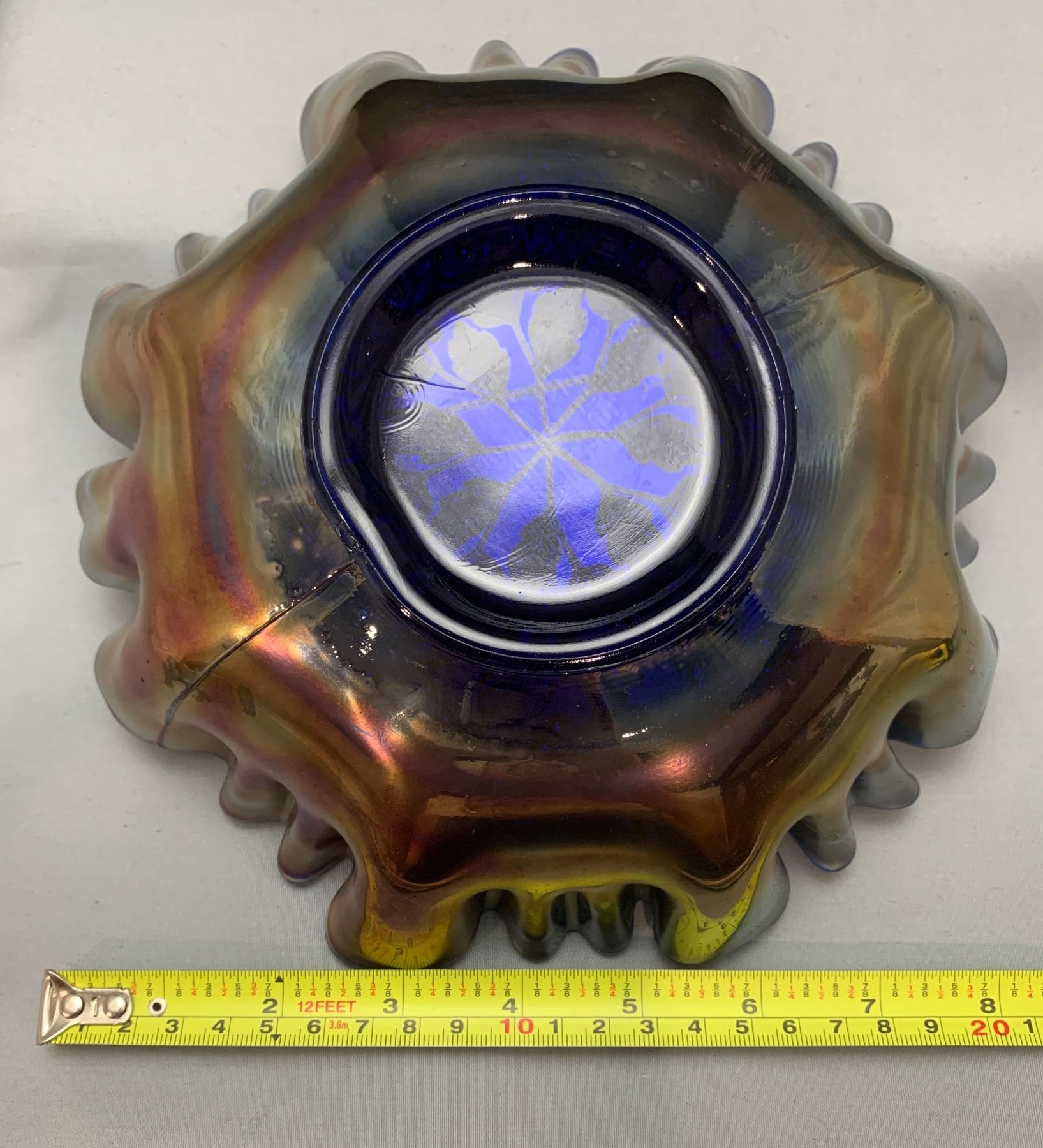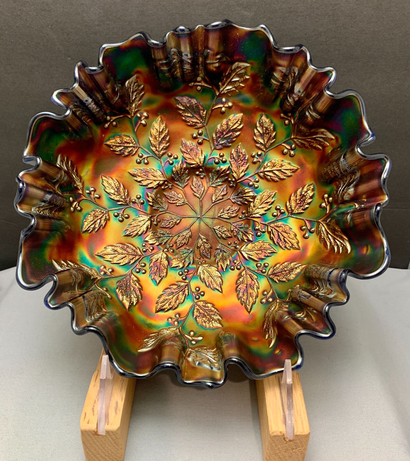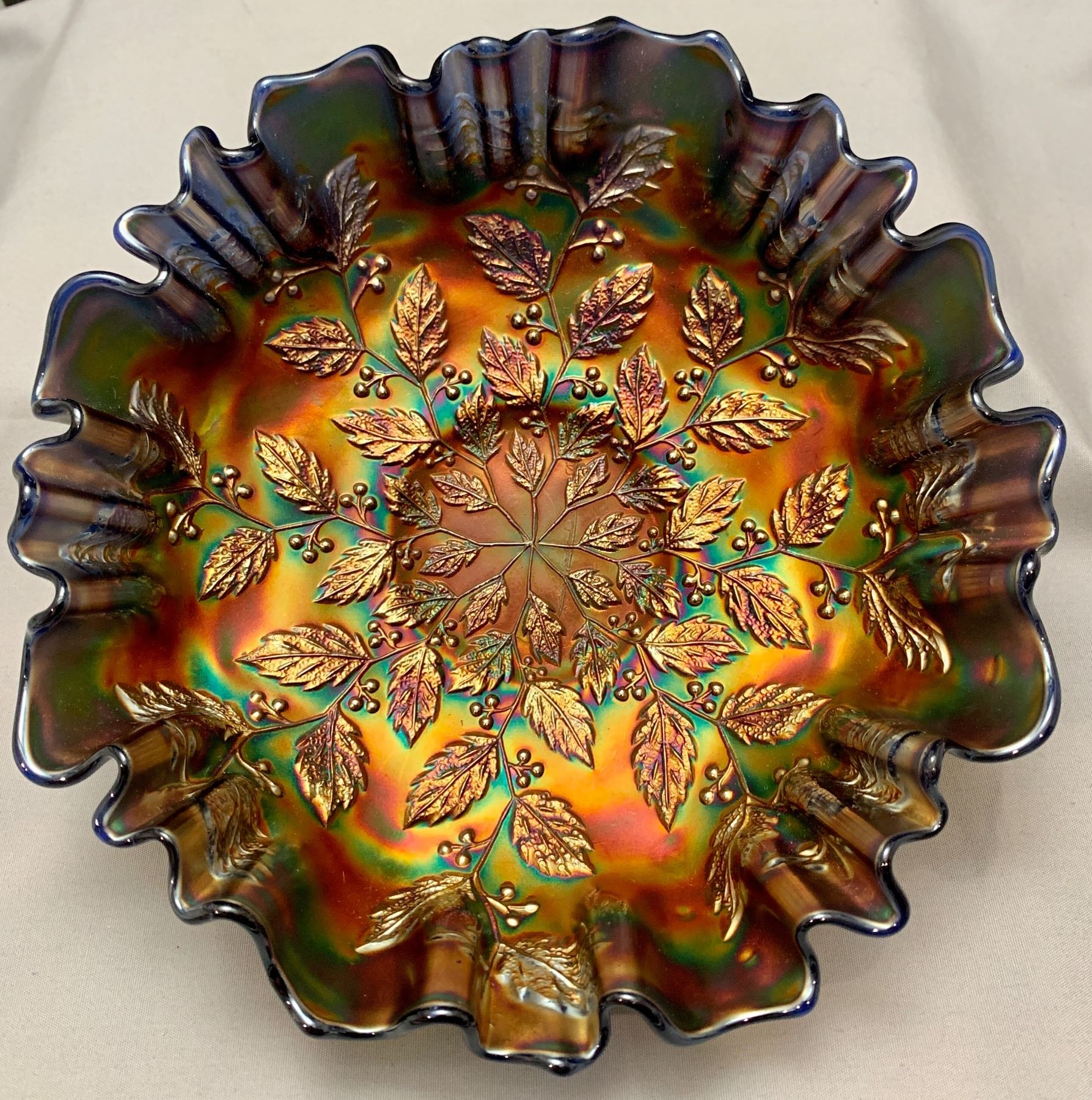 Fenton Cobalt Blue “Holly” Crimped 3 in 1 Edged 8 1/2” Carnival Glass Bowl - Rare Shaped Edge!